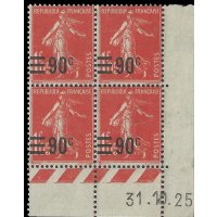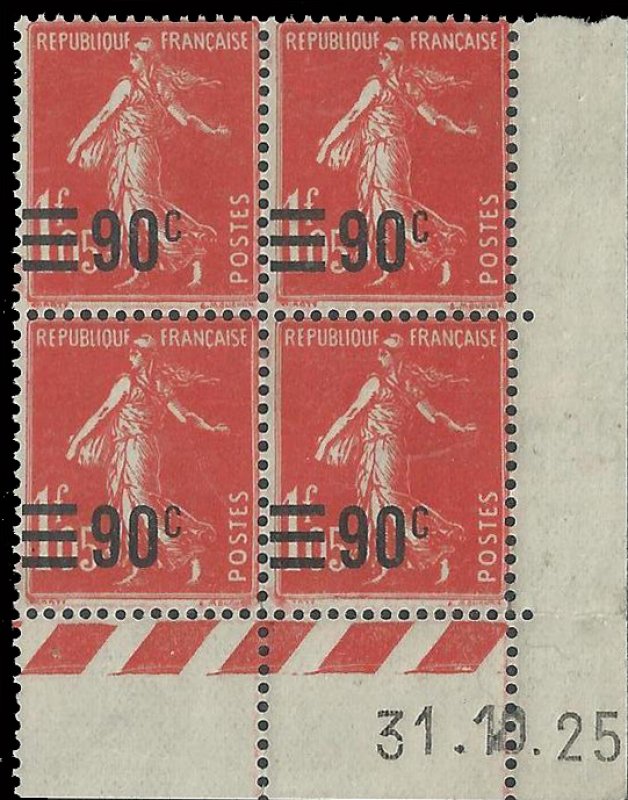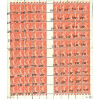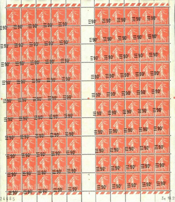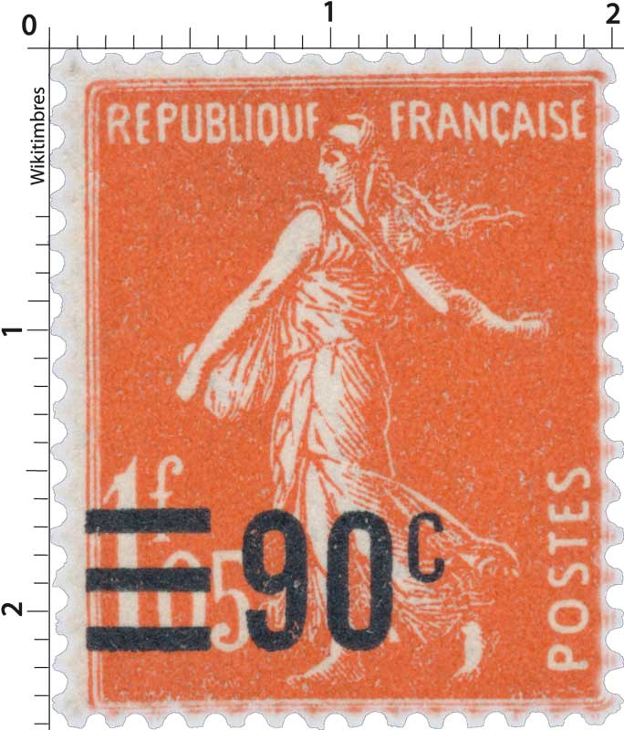Surcharge 90 c sur 1 f 05 vermillon du type Semeuse fond plein à inscriptions grasses, tirée en octobre 1926 pour répondre à l’augmentation rapide des tarifs postaux. Le timbre réutilise la valeur 1 f 05 de Roty, dont la plaque typographique avait été abondamment exploitée depuis 1925, et reçoit ici une surcharge rouge uniforme, caractéristique de la série d’ajustements tarifaires de 1926-1927. L’exemplaire appartient à la dernière phase d’utilisation de la Semeuse camée avant la généralisation progressive du type Pasteur sur les valeurs supérieures. |