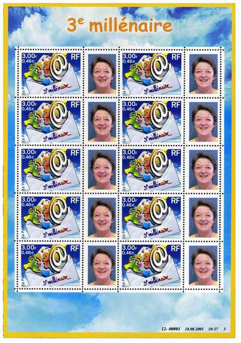 | Commentaire | Émis en bloc-feuillet de 10 timbres avec vignette. Description synthétique du visuel du timbre : Dans la série des semi-permanents, La Poste propose une mini-feuille de timbres dits personnalisés, permettant d’offrir au public un média de communication individuelle à travers le timbre. Il sera donné l’occasion à l’usager de créer ses propres timbres en faisant imprimer une photo de son choix sur la vignette accolée au timbre. La mini-feuille 3e millénaire sera également émise avec vignettes pré-illustrées. Le visuel, orienté nouvelles technologies, illustre le mariage du courrier et de l’internet, symbole de l’entrée dans le 3e millénaire. Timbre sans millésime |