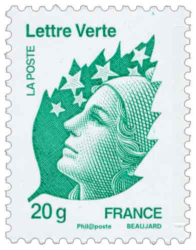| Commentaire | Pour réduire son empreinte écologique, La Poste a lancé le 1er octobre 2011 une nouvelle offre de courrier rapide pour les particuliers et les entreprises, en J + 2. Ce nouveau service s'inscrit dans une optique de développement responsable, puisque le courrier n’est pas transporté par avion. Ce service plus économique (0,57 € pour le 20 g) est commercialisé avec un nouveau timbre “Lettre Verte” dont le visuel a été réalisé par Yves Beaujard d’après la Marianne et l’Europe. Le visage de Marianne s’inscrit dans une forme de feuille déclinée dans 4 versions de vert pour les 4 tarifs 20 g, 50 g, 100 g et 250 g.