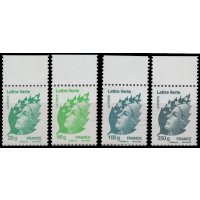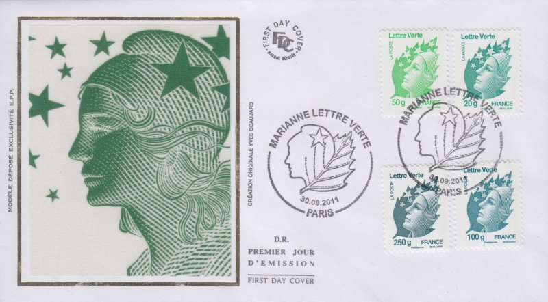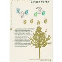 | Commentaire | Pour réduire son empreinte écologique, La Poste a lancé le 1er octobre 2011 une nouvelle offre de courrier rapide pour les particuliers et les entreprises, en J + 2. Ce nouveau service s'inscrit dans une optique de développement responsable, puisque le courrier n’est pas transporté par avion. Ce service plus économique (0,57 € pour le 20 g) est commercialisé avec un nouveau timbre “Lettre Verte” dont le visuel a été réalisé par Yves Beaujard d’après la Marianne et l’Europe. Le visage de Marianne s’inscrit dans une forme de feuille déclinée dans 4 versions de vert pour les 4 tarifs 20 g, 50 g, 100 g et 250 g.