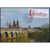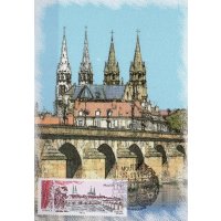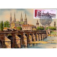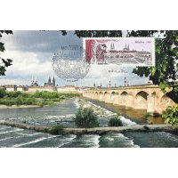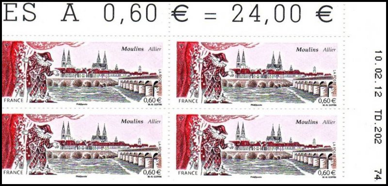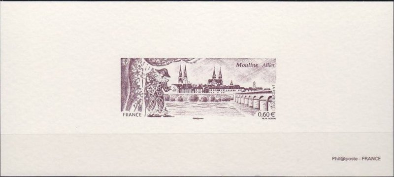 | Commentaire | Timbre à date “Premier Jour” conçu par Jean-Paul Cousin Visuel : la ville de Moulins, capitale des ducs de Bourbon, mise en scène grâce à la présence des rideaux de théâtre et d'Arlequin qui apporte le mouvement. Ce personnage, revenant en permanence dans l'histoire du théâtre, rappelle Théodore Faullain de Banville (1823-1891, poète, dramaturge et auteur dramatique du XIXe siècle, natif de Moulins). Au centre : les hauts clochers de la cathédrale Notre-Dame-de-l'Annonciation (1468 à 1550, modifiée entre 1823 et 1857) et de l’église du Sacré-Cœur, ainsi que le beffroi au dôme de cuivre du Jacquemart - À droite, le pont Régemortes ; nom de l'ingénieur qui l'a conçu et édifié de1753 à 1763 pour enjamber et supporter les crues violentes ayant emportées plusieurs ponts sur l'Allier. Préfecture du département de l’Allier et ancienne capitale du duché de Bourbon, Moulins doit son nom aux nombreux moulins qui longeaient les berges de l’Allier, affluent de la Loire, qui la traverse. Située à la limite du Bourbonnais et de la Sologne, Moulins présente un intéressant centre-ville, dominé par les hauts clochers de la Cathédrale Notre-Dame, le Sacré- Coeur, le beffroi, ainsi que le pont Régemortes, achevé en 1762, tous ici représentés sur le timbre de format semi-panoramique. Mais Moulins compte aussi dans son patrimoine architectural le magnifique Centre National du Costume de Scène qui assure la conservation et l’exposition des plus beaux costumes d’opéra, de danse et de théâtre, et présente jusqu’au 20 mai 2012 une exposition sur “l’envers du décor”, les coulisses de la scène théâtrale au XIXe siècle. |