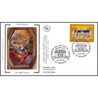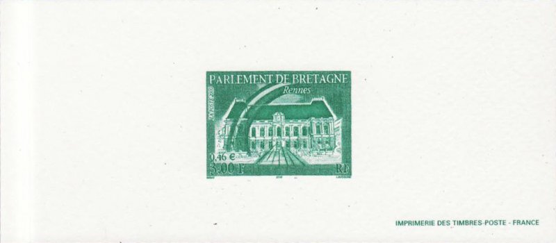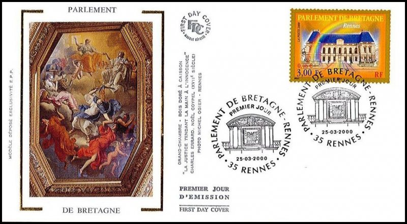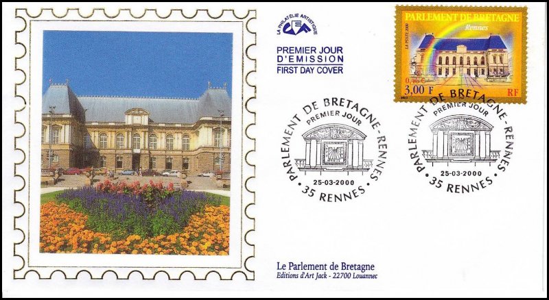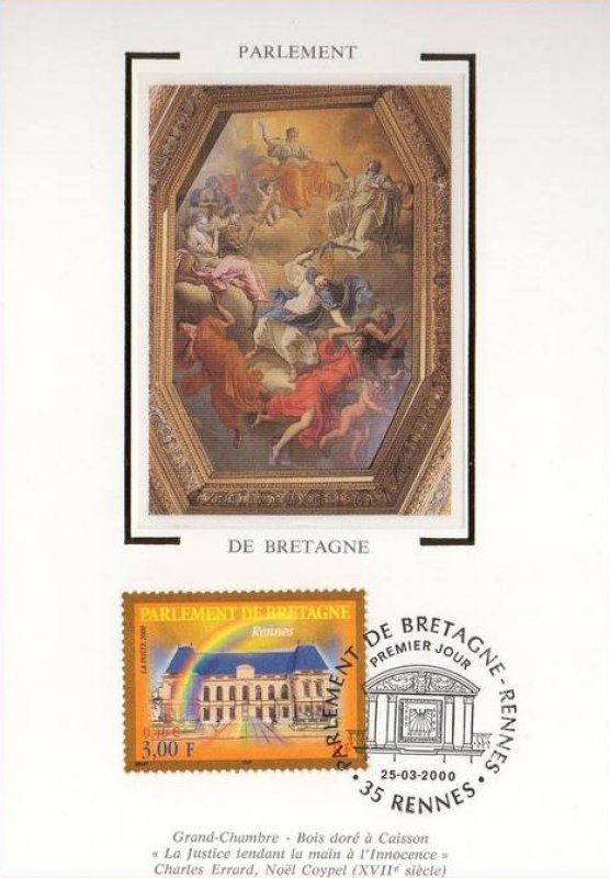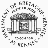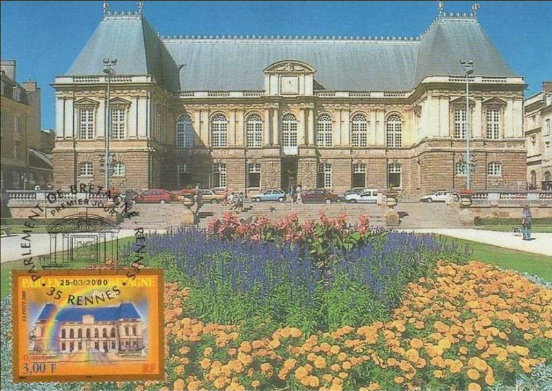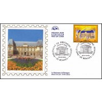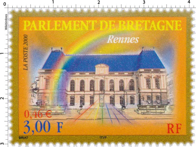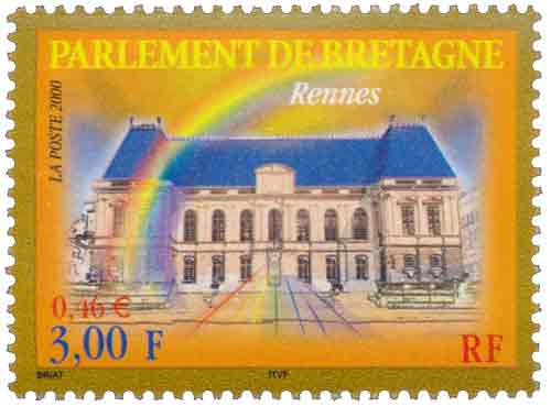 | Commentaire | Description synthétique du visuel du timbre : Situé dans la ville de Rennes, le Parlement de Bretagne symbolisait à la fois les libertés bretonnes et le service du droit. Il témoignait aussi de l’architecture et des décors des années 1650-1660. Dans la nuit du 04 février 1994, un incendie ravageait le palais du Parlement de Bretagne. Le bâtiment, mais aussi les toiles et boiseries furent fortement endommagés. Aujourd’hui, grâce à la mobilisation de tous (grand public, Association pour la renaissance du Palais du Parlement, etc.), la restauration du Parlement de Bretagne s’achève. L’arc en ciel symbolise le renouveau et la renaissance du bâtiment après l’incendie dévastateur. Le visuel s’agrémente de dentelures dorées. Les traces colorées, en perspective, dirigées vers l’entrée, invitent à la visite. |