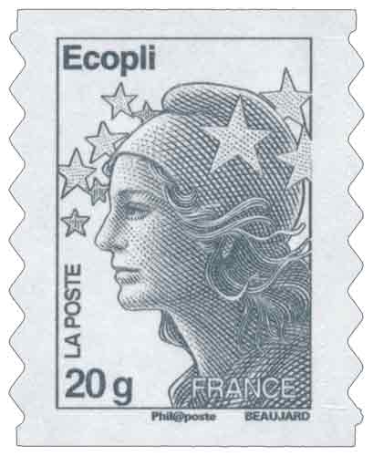 | Commentaire | Existe également su papier gommé. Émise également sans barre phosphorescente depuis le lancement de la lettre verte (lettre verte = 1 barre de phospho) Leur visuel évolue donc légèrement. Chaque timbre reçoit une mention “Ecopli”, “Lettre prioritaire”, “Monde” ou “Europe” en haut à gauche. Le poids autorisé s’inscrit en bas à gauche. La mention “France” bascule de gauche à droite. Les tarifs Ecopli 50 g et Europe 50 g disparaissent. La Marianne Ecopli 20 grammes abandonne sa couleur verte au profit d’un gris moyen. De plus, elle perd le fond de couleur du timbre pour faciliter sa reconnaissance par les machines de tri. Les Marianne de la monnaie (0,01 €, 0,05 €, 0,10 € et 1,00 €) sont inchangées et toujours disponibles. À partir du 1er juillet, ces nouvelles Marianne sont émises en planches, roulettes, carnets et planches autocollantes |