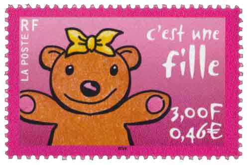 | Commentaire | Description synthétique du visuel du timbre : En rupture par rapport aux timbres émis en 1999 (cigogne sur fond au ton pastel), ce timbre offre un style très différent, plus coloré, plus gai et plus animé. Le jouet fétiche de générations entières de bébés, un ours en peluche, que féminise un nœud dans les cheveux, illustre le visuel. Un visuel quasi similaire, décliné en bleu, illustre le timbre c’est un garçon. Timbre sans millésime |
