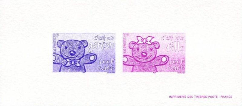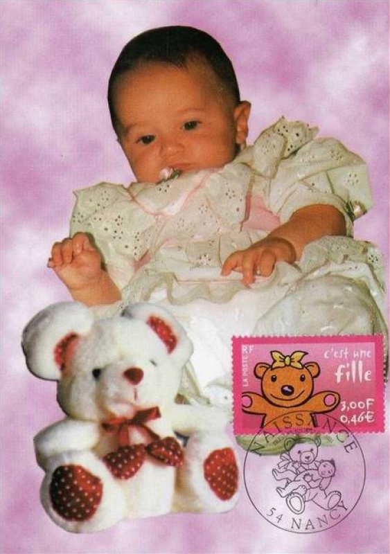 | Commentaire | Description synthétique du visuel du timbre : En rupture par rapport aux timbres émis en 1999 (cigogne sur fond au ton pastel), ce timbre offre un style très différent, plus coloré, plus gai et plus animé. Le jouet fétiche de générations entières de bébés, un ours en peluche, que féminise un nœud dans les cheveux, illustre le visuel. Un visuel quasi similaire, décliné en bleu, illustre le timbre c’est un garçon. Timbre sans millésime |