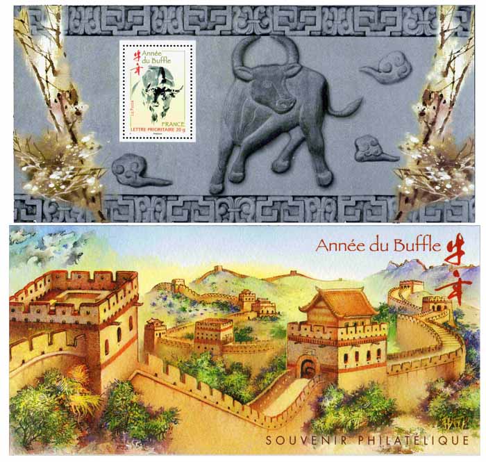 | Description | Nouvel an chinois 2009 Année du Buffle - une carte deux volets pliée dans laquelle est inséré - - un feuillet gommé incluant le visuel du timbre « Année du Buffle » extrait du bloc Nouvel an chinois |