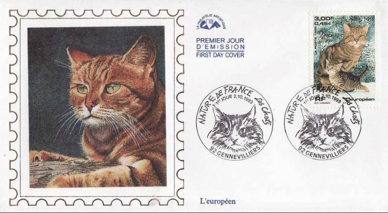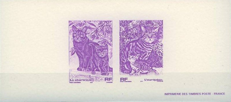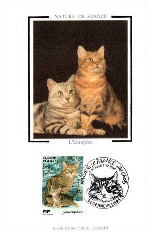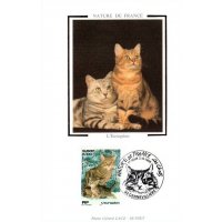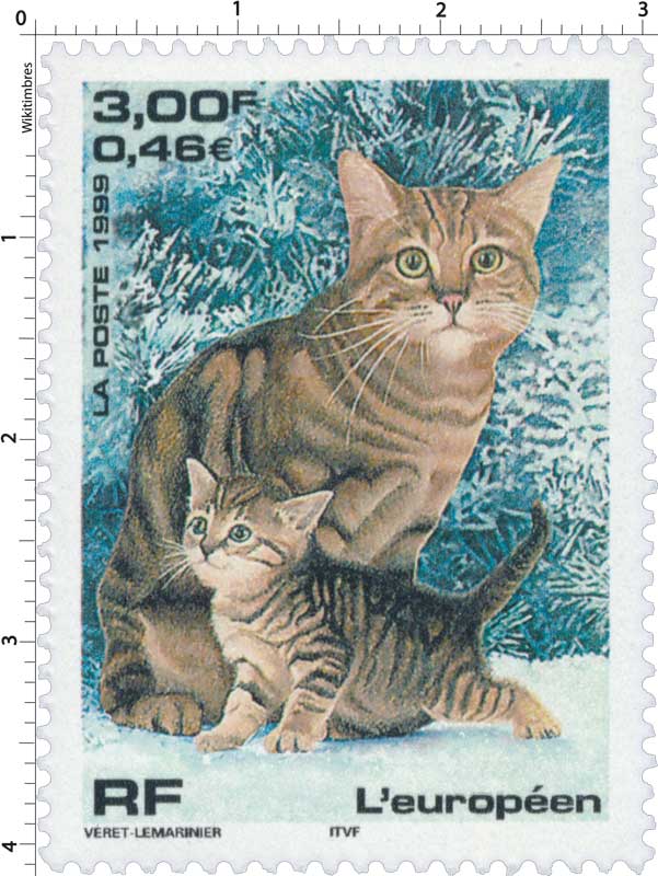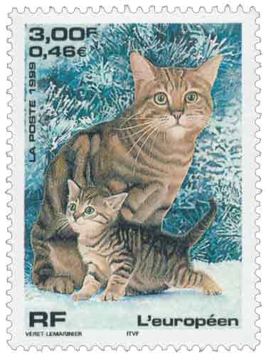 | Commentaire | - Description synthétique du visuel du timbre : Longtemps qualifié de chat des rues ou de gouttière, l’européen constitue un type intermédiaire entre les races persane et siamoise. Son corps harmonieux et bien charpenté le rend vigoureux sans être lourd. Il dégage au contraire une grande impression de souplesse. La robe présente les couleurs les plus diverses, le poil est court et serré. Ce chat possède une intelligence remarquable doublée d’une subtilité étonnante. Il tient à garder son indépendance et s’il sait offrir son affection, il demande à être payé de retour. Le chaton et l’adulte figurent près d’un sapin enneigé évoquant l’hiver. |