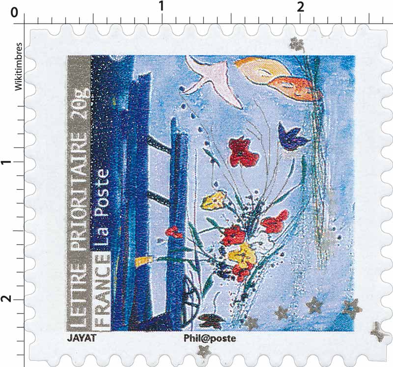 | Commentaire | La mise en vente anticipée a lieu les 7 et 8 novembre au Salon philatélique d'automne, à Paris. Le timbre à date premier jour par Marot représente une femme soufflant sur un pissenlit, les aigrettes se dispersant autour des mots-messages « Amitié, amour, bonheur, santé ». Timbre sans millésime |