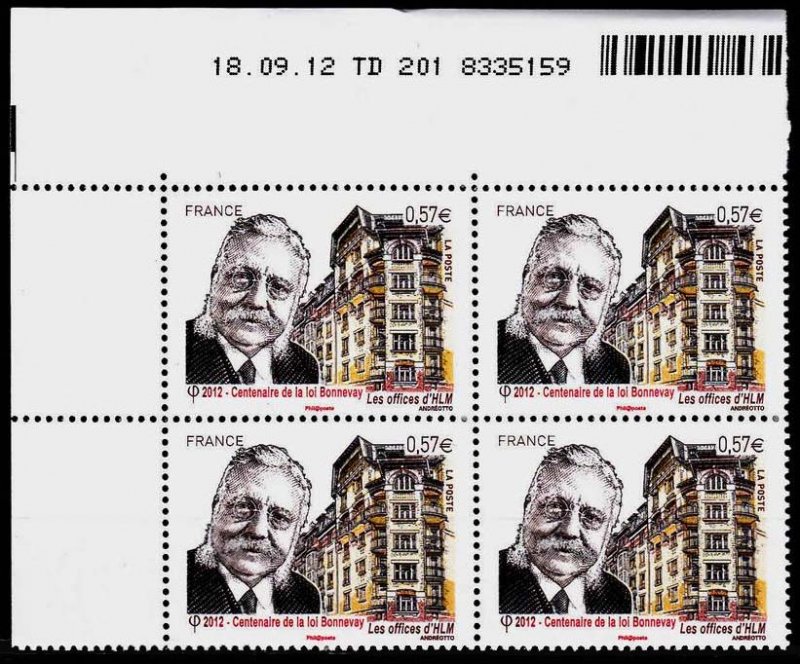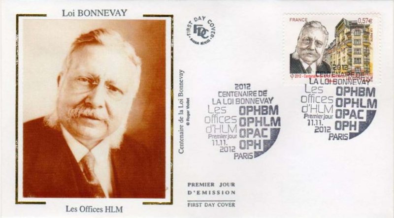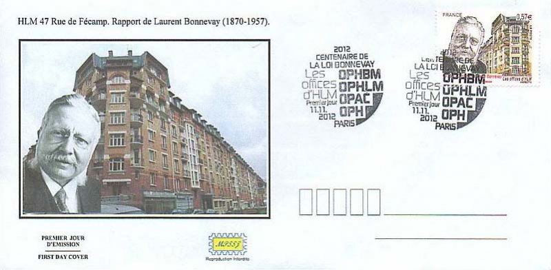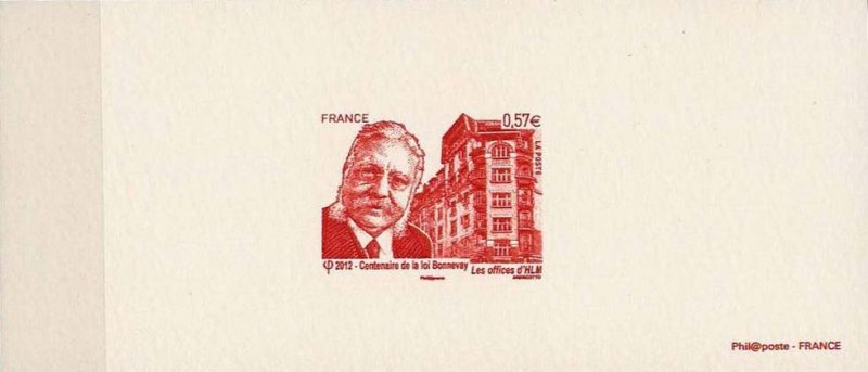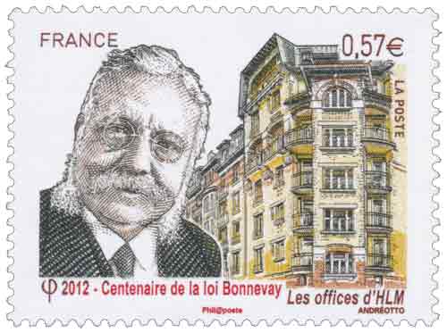 | Commentaire | Père de la première loi sur le logement social en 1912. Émis en planche : 8 bandes de 6 TP C’est vers 1850 que naît l’idée que l’État ou les collectivités locales pourraient participer au financement de logements “sociaux”, la réalisation de ceux-ci étant laissée à des maîtres d’ouvrage privés qui garantiraient leur salubrité. À la suite des lois Siegfried en 1894, Strauss en 1906 puis Ribot en 1908, une mobilisation populaire conduit le gouvernement à se préoccuper à nouveau de la situation du logement des ouvriers et à faire le point de l’application de la législation en vigueur. La loi Bonnevay, du nom de son créateur Laurent Bonnevay, crée les offices publics communaux et départementaux d’habitations à bon marché, ancêtres des HLM. Le service public du logement est créé. Sur le timbre : le portrait de Laurent Bonnevay et un exemple d’HLM, rue de Fécamp à Paris, construit en 1924 à la suite de cette loi. |