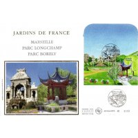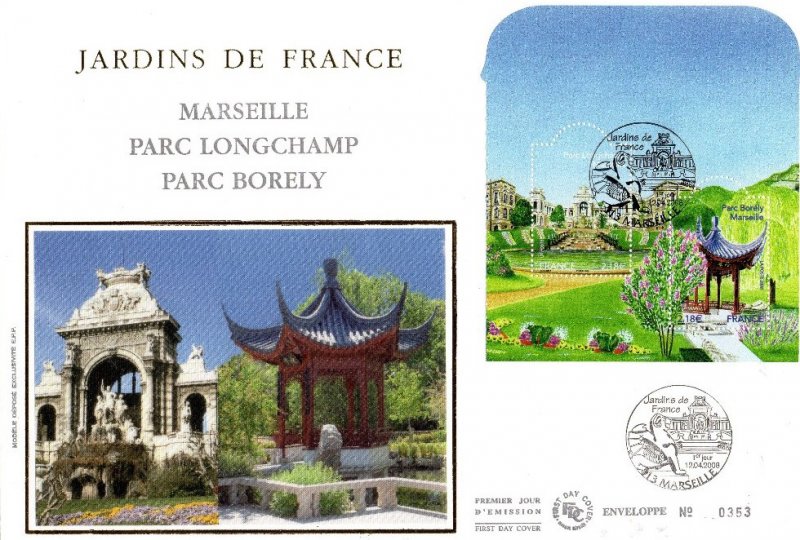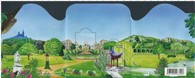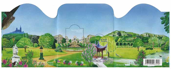 | Commentaire | Le bloc « Jardins de France est consacré en 2008 aux jardins de Marseille : le Parc Borély et le Parc Longchamp. Le 8 juillet 1847, les eaux de la Durance arrivent sur le plateau Longchamp, suivant le canal tracé par Frantz Major de Montricher. Afin de commémorer cet évènement, l’architecte Henry Espérandieu est chargé de réaliser un château d’eau, un jardin et des cascades , parallèlement à ces aménagements le concepteur du canal propose la création d’un jardin zoologique. Dédié depuis plus de deux siècles à la gloire de l’Eau, des Arts et des Sciences Quant au parc Borély, le plus fréquenté des espaces verts de Marseille, d’une superficie de 17 ha il est constitué d’un jardin botanique et d’un jardin traditionnel chinois offert par la ville de Shanghai en 2004. Plusieurs sculptures ornent ce parc. |