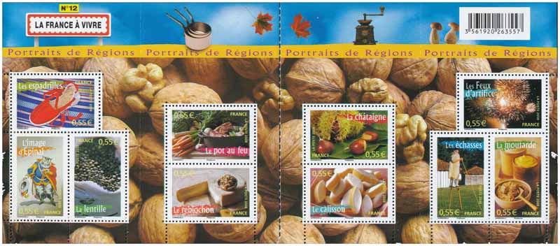 | Commentaire | La série philatélique Portraits de Régions inaugurée en 2003 célèbre la France à travers la gastronomie, les coutumes, et les traditions populaires de ses régions. Mentions légales : Création de B. Ghiringhelli, crédit photos timbres : « l’image d’Épinal » :Photo D.Cordier/Imagerie d’Épinal, «les espadrilles» : Photo M.H. Carcanague, «la lentille» : Photo J.D.Sudres, le pot au feu : Photo J.D.Sudres, «le reblochon» : Photo J.D.Sudres, « la châtaigne » : Photo Cournut/Sunset, « le calisson » : Photo M.H. Carcanague, « les échasses » : Photo J.D.Sudres, « la moutarde » : Photo Foodpix/Jupiterimages, « les feux d’artifice » : Photo Wallis/Sunset. Bandeau :feuille d’érable : Siede Preis/PhotoDisc, « champignons » :I. Rorzebaum et F. Cirou/PhotoAlto. Fond du bloc : B. Ghiringhelli. |