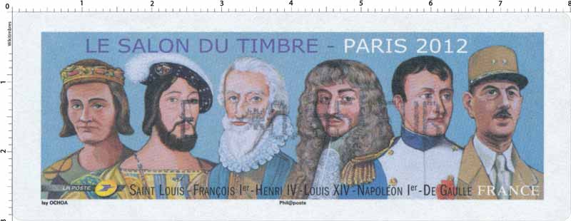 - LISA Le salon du Timbre 2012 Grands personnages de l’Histoire, Saint Louis, François 1er, Henri IV, Louis XIV, Napoléon 1er, Gle de Gaulle