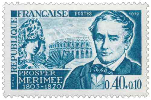 | Commentaire | Émis en 1970 dans la série des timbres commémoratifs surtaxés au profit de la Croix-Rouge française, le timbre-poste consacré à Prosper Mérimée rend hommage à une figure majeure de la littérature et du patrimoine français, à la fois écrivain, historien et inspecteur général des Monuments historiques, dont l’action a profondément marqué la sauvegarde du patrimoine architectural national ; destiné à l’affranchissement de la lettre simple pour l’intérieur, ce timbre horizontal imprimé en taille-douce rotative s’inscrit dans la tradition des émissions françaises associant culture et solidarité, tout en illustrant un auteur dont l’œuvre, fondée sur une écriture concise et incisive, annonce le réalisme par-delà le romantisme de son temps, depuis Chronique du règne de Charles IX jusqu’aux nouvelles qui ont façonné son renom, telles Colomba ou Carmen ; cette dernière, inspirée de ses voyages en Espagne et de son goût pour l’observation des mœurs et des passions primitives, est discrètement évoquée dans la composition par un arrière-plan faisant référence à l’Andalousie et aux arènes de Nîmes, rappelant le destin singulier d’un récit devenu mythe universel après son adaptation lyrique par Bizet en 1875 ; l’émission met également en lumière le rôle administratif et culturel de Mérimée, dont les tournées d’inspection à partir de 1834 contribuèrent à sauver de la ruine des monuments majeurs tels que la basilique de Vézelay ou les ensembles romans du Sud-Ouest, démarche fondatrice d’une politique patrimoniale moderne, tandis que son ouverture aux cultures étrangères, de la Russie à la Méditerranée orientale, participa à l’élargissement du regard littéraire français au XIXᵉ siècle, conférant à ce timbre de France une double portée, à la fois philatélique et culturelle, emblématique des émissions de l’année 1970. Article rédigé pour WikiTimbres |