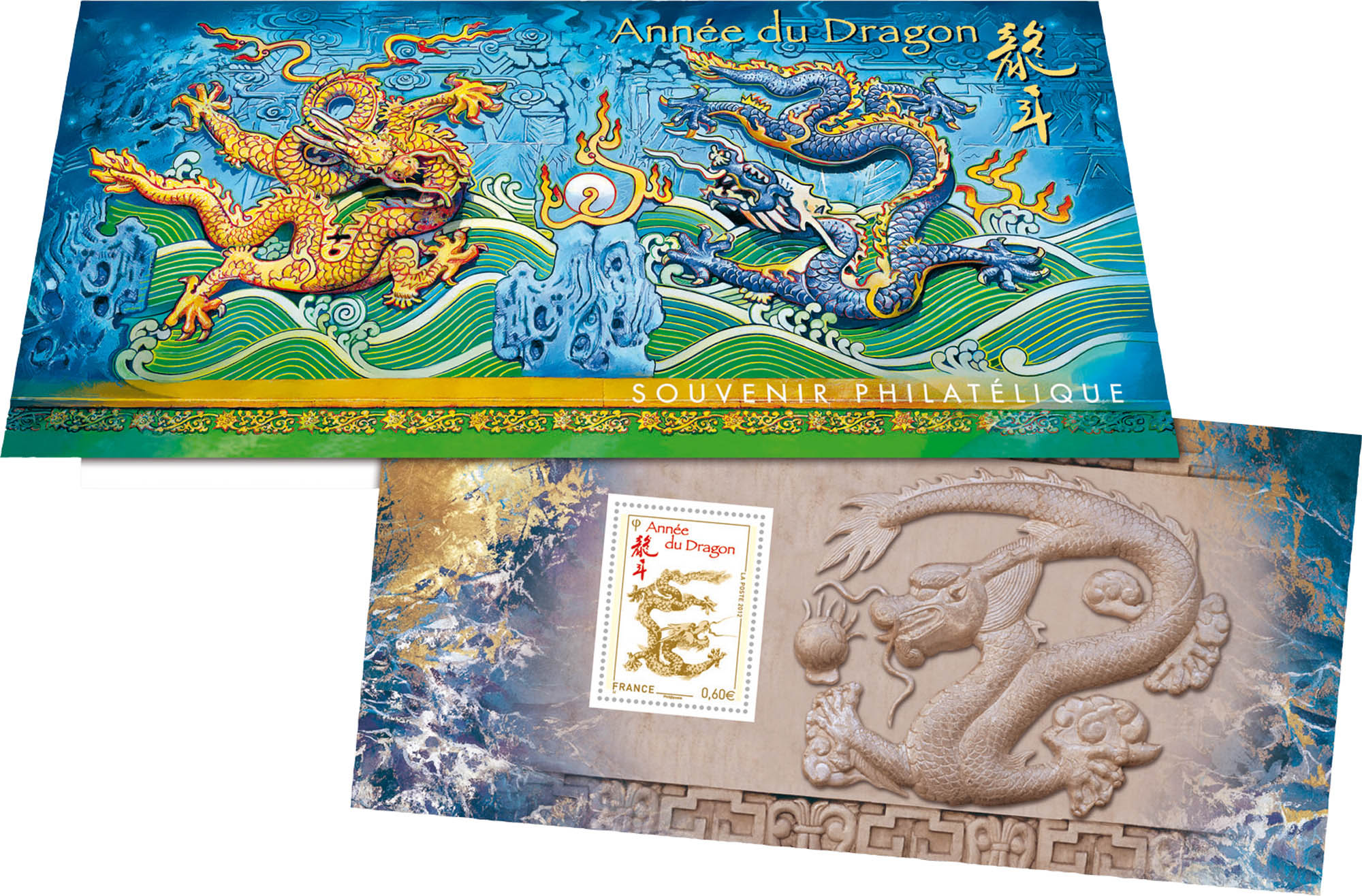 | Commentaire | L'Année du Dragon commence le 13 janvier 2012 et La Poste la célèbre par un bloc, un document philatélique, une gravure et ce très beau souvenir philatélique. Sa couverture est illustrée d'un détail du mur aux 9 dragons du Parc Belhai à Pékin : ici 2 dragons se disputent une balle entre vagues et nuages. |