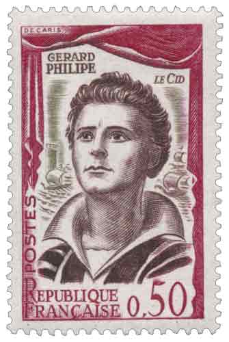 | Commentaire | Visuel : Gérard Philipe interprétant le rôle de Don Rodrigue, dans la tragi-comédie de Pierre Corneille (1606-1684, dramaturge, poète) : "Le Cid" - mise en scène de Jean Vilar au Festival d'Avignon 1951. Gérard Philipe né à Canne le 4 déc.1922, fut inhumé en nov.1959, à Ramatuelle (Var), dans le costume de Don Rodrigue. Émis par la France en 1961 dans la série consacrée aux acteurs célèbres et à leurs rôles, le timbre-poste dédié à Gérard Philipe s’inscrit dans une politique commémorative visant à fixer dans la mémoire postale l’image d’un interprète emblématique du renouveau théâtral de l’après-guerre, en choisissant de le représenter dans le rôle du Cid, incarnation majeure du répertoire classique portée sur les scènes du Théâtre National Populaire à une époque où la démocratisation culturelle constituait un axe fort de l’action publique, cette émission de 1961 rappelant à la fois la diffusion internationale de l’acteur par le cinéma et l’importance accordée par l’institution postale à la transmission du patrimoine dramatique français, le recours à la gravure en taille-douce traduisant la volonté de conférer à cet hommage une dimension de permanence et de solennité en accord avec la place occupée par Gérard Philipe dans l’histoire du théâtre et du cinéma en France. Article rédigé pour WikiTimbres |