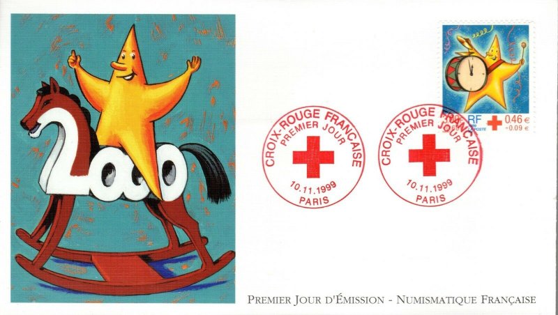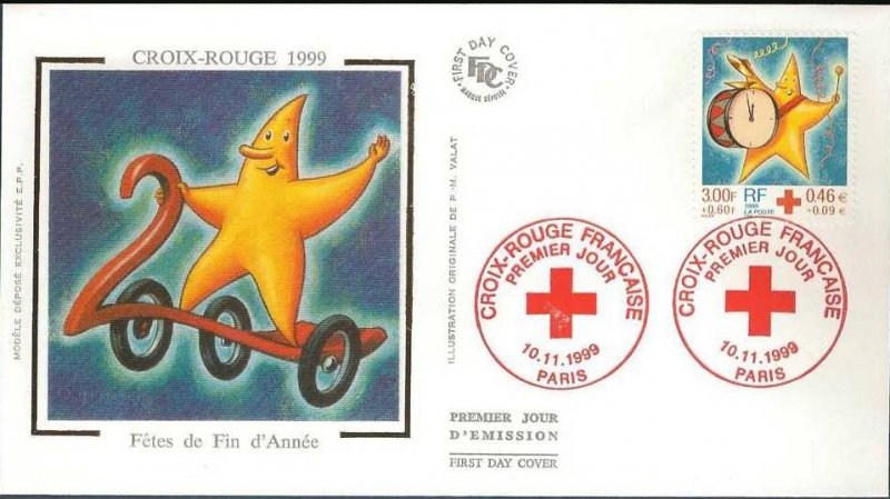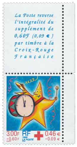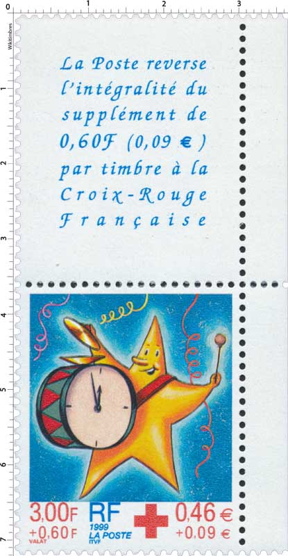 | Commentaire | Description synthétique du visuel du timbre : Dans une ambiance festive et colorée, une étoile nous invite, sous une pluie de serpentins, à fêter la fin de l’année. La présence du tambour évoque l’aspect musical des fêtes de fin d’années. Son flanc orné d’une horloge est un clin d’œil au passage à minuit, et plus particulièrement au passage à l’an 2000. Ce timbre est grevé d'une surtaxe au profit de la Croix Rouge française. Le même timbre issu de feuille est dentelé 12 demi x 13. Les timbres de feuilles comme les timbres de carnets sont imprimés sur un papier avec azurants optiques visibles sous UV. |