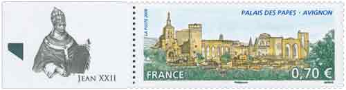 La manifestation premier jour, dont le timbre à date de Claude Perchat représente les armes du pape Clément VI, a lieu les 7 et 8 mars au palais, à Avignon. Construit à partir de 1335, principalement par les deux papes bâtisseurs, Benoît XII et Clément VI, le Palais des Papes est le symbole du rayonnement de l'Église sur l’Occident chrétien au XIVe siècle. Entouré de remparts imposants, flanqué de quatre tours gigantesques, le monument est aujourd'hui le plus grand palais gothique du monde, et l'un des plus visité des monuments historiques en France. Il constitue - avec le Pont Saint Bénezet, les Remparts, le Petit Palais et la cathédrale des Doms - un ensemble architectural unique classé Patrimoine Mondial de l'Humanité par l'Unesco. Outre la visite de lieux riches d’histoire (fresques, appartements...), le Palais des Papes offre est aussi le siège de nombreux et célèbres événements culturels, dont le Festival d'Avignon créé par Jean Vilar en 1947.
