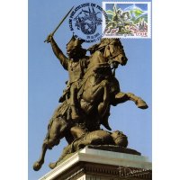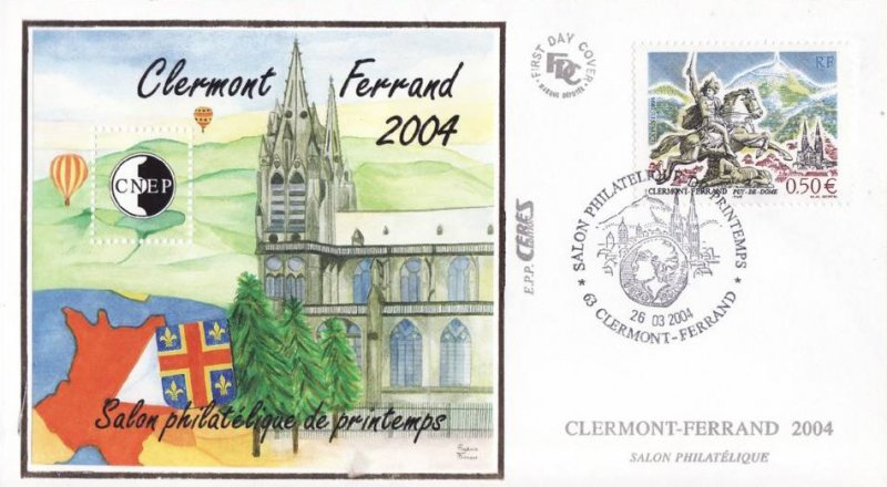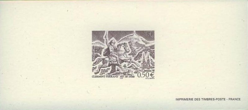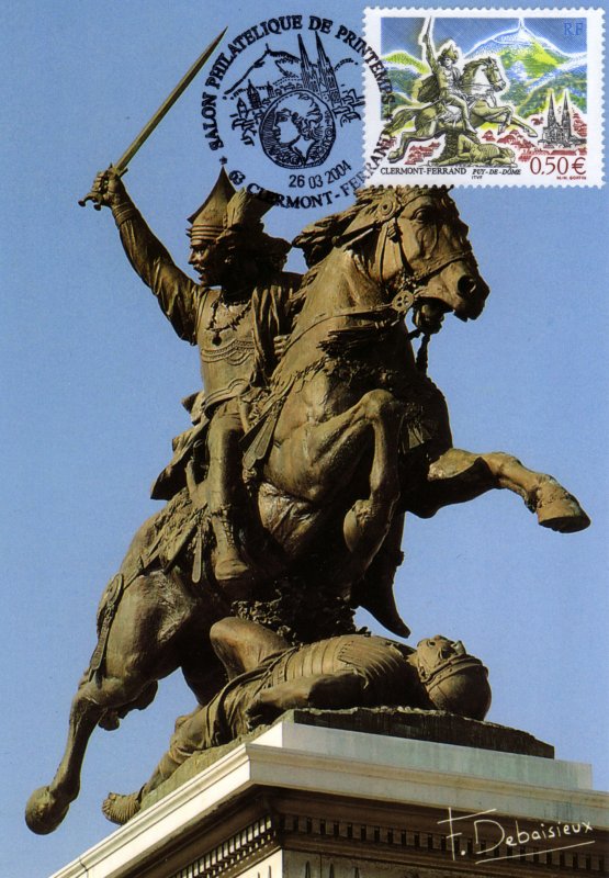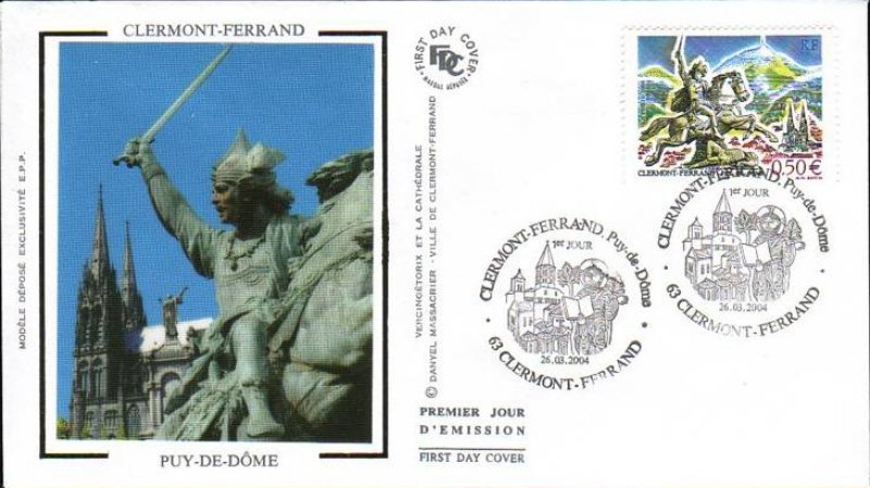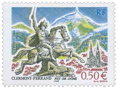 | Commentaire | Située dans la plaine de la Limagne, chef-lieu du Puy-de-Dôme et de la région d’Auvergne, Clermont-Ferrand est la seule grande métropole du Massif central. Deux symboles auvergnats, Vercingétorix et le puy de Dôme, point culminant de la chaîne des Puys, illustrent le timbre. Vercingétorix, issu d’une noble famille arverne, mit César et son armée en échec à coté de Clermont-Ferrand. Il fait l’objet de nombreuses œuvres sculptées et peintes, conservées dans la capitale auvergnate dont la statue équestre représentée sur le timbre et sculptée par Frédéric-Auguste Bartholdi |