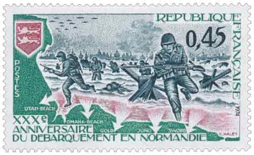 Émis en 1974 pour commémorer le trentième anniversaire du Débarquement en Normandie, ce timbre s’inscrit dans la série d’hommages rendus par l’administration postale française aux grandes étapes de la Libération. Il rappelle l’opération militaire décisive du 6 juin 1944, point de départ de la reconquête du territoire et de l’effondrement progressif du dispositif allemand à l’Ouest. Le sujet associe étroitement la dimension historique et la lecture symbolique, en mettant en avant la Normandie comme terre de jonction entre les forces alliées et le sol français. L’évocation du port artificiel d’Arromanches, prouesse technique essentielle au succès de l’opération Overlord, souligne l’importance logistique du débarquement autant que son ampleur humaine et militaire. Par son iconographie et sa composition gravée en taille-douce, le timbre insiste sur la coopération des forces anglo-saxonnes et franco-normandes, réunies dans un même combat pour la restauration de la liberté en Europe occidentale. Le blason normand, intégré au visuel, prend ici une valeur renouvelée, non plus seulement médiévale ou régionale, mais universelle, associée à la libération du continent et à la victoire des démocraties. L’émission intervient dans un contexte mémoriel encore très vivant au début des années 1970, marqué par la présence des témoins directs et par une volonté institutionnelle de transmettre l’histoire de la Seconde Guerre mondiale à travers des supports accessibles au grand public. Utilisé pour l’affranchissement courant, ce timbre a ainsi contribué à diffuser, au quotidien, le souvenir d’un événement fondateur de l’histoire contemporaine, tout en occupant une place centrale dans les collections consacrées à la Libération et aux grandes opérations militaires du conflit. |