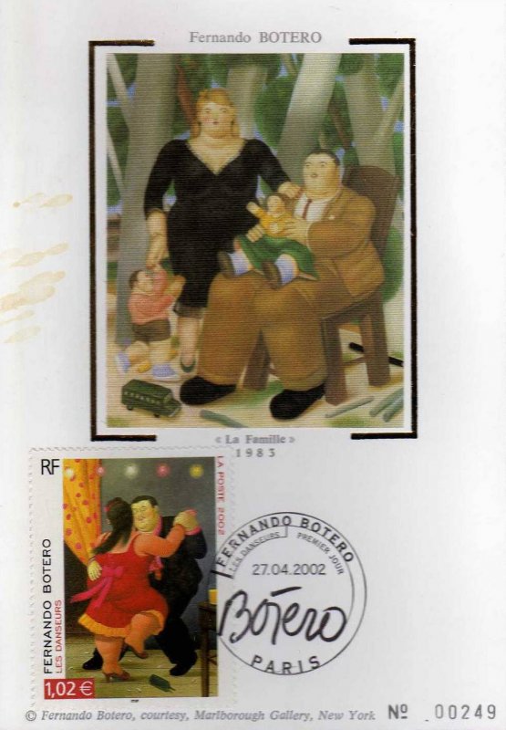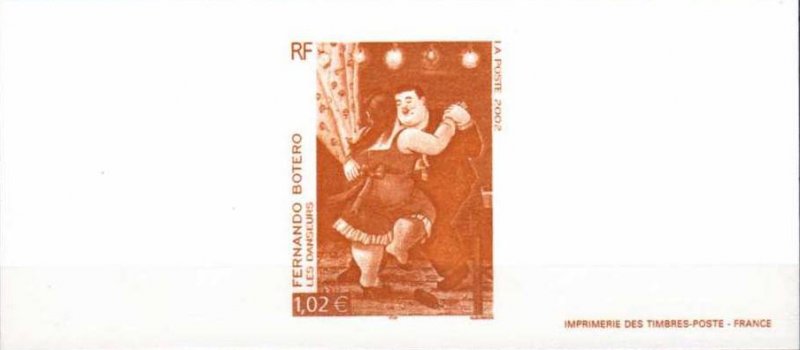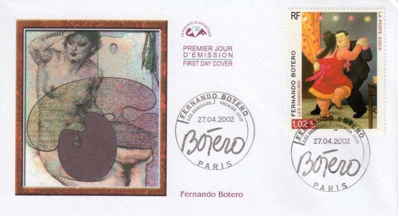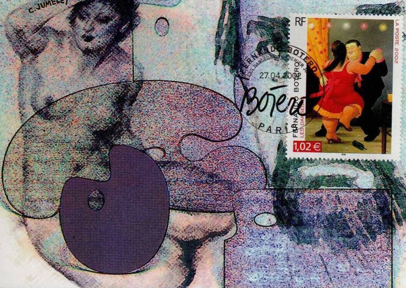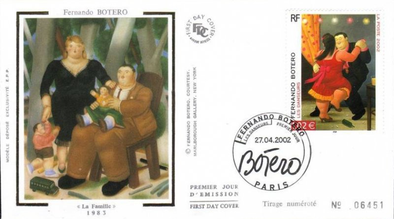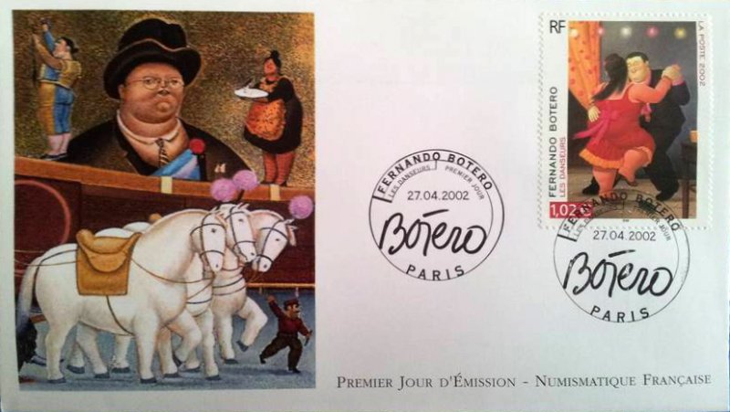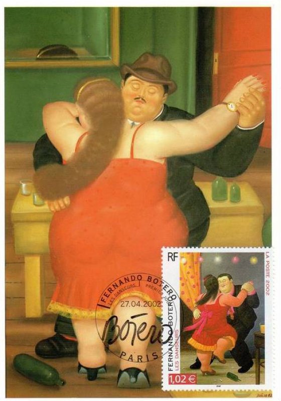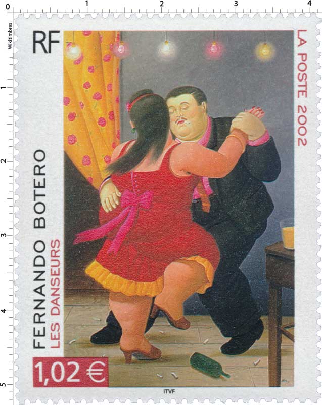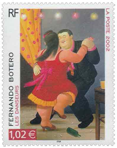 | Commentaire | Description synthétique du visuel du timbre : Fernando Botero, artiste de renommée internationale, plébiscité par le grand public et les collectionneurs, pratique plusieurs genres traditionnels : la nature morte, le paysage, la scène de genre. Il tire les sujets de ses tableaux d’un monde mythique, populaire et comique d’où il émane une humanité, une naïveté et une tendresse certaine. Artiste sud-américain, il plonge ses racines dans l’art populaire local sans renier la tradition européenne, Piero, Goya, Manet, Picasso …. L’œuvre Les danseurs illustre sa science des volumes qui jouent dans l’espace, son art de juxtaposer les formes simples et voluptueuses, véritable invitation à se promener autour des volumes et à les caresser. |