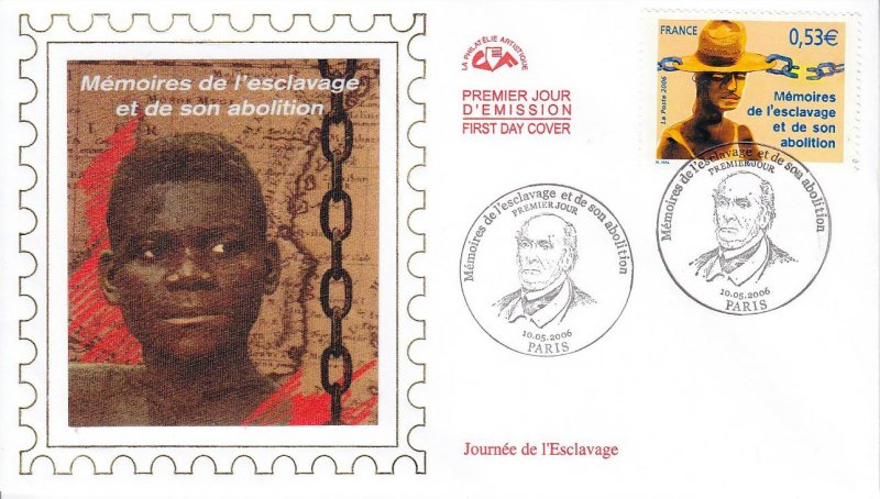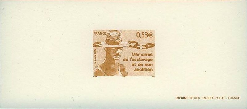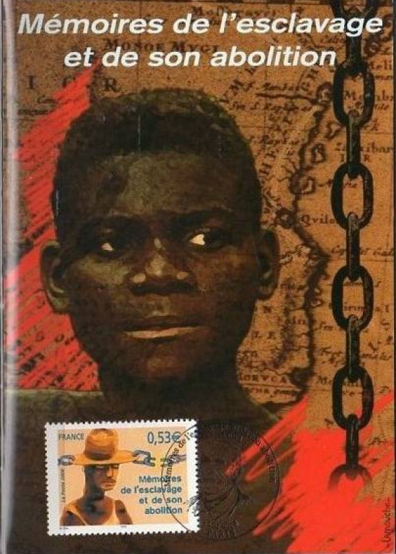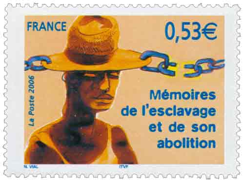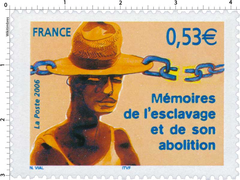| Commentaire | Le 10 mai 2001, l’esclavage a été reconnu « crime contre l’humanité » par l’Assemblée nationale. Annoncée par le Président de la République le 30 janvier 2006, la date du 10 mai devient jour de commémoration des mémoires de la traite négrière, de l’esclavage et de leurs abolitions, constituant ainsi un acte symbolique fort de la reconnaissance du passé des esclaves constitutif de notre histoire collective. Sur le visuel, la chaîne au chapeau rappelle que l’esclavage était aussi un asservissement de l’esprit, la chaîne brisée symbolisant l’abolition. |
