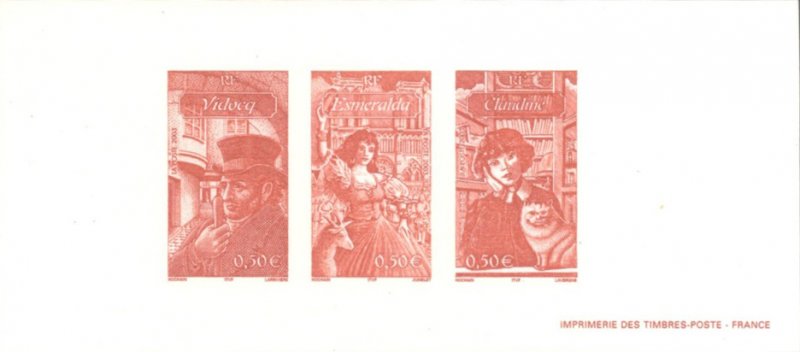 | Commentaire | Visuel : la belle Esméralda, accompagnée de sa chèvre Djali, danse sur le parvis de la cathédrale Notre-Dame de Paris, pendant que Quasimodo, le bossu, est couronné "roi des fous". Parias tous deux, détestés et honnis - lui, pour sa difformité, elle, pour sa grâce surnaturelle et son appartenance au peuple des bohémiens. |