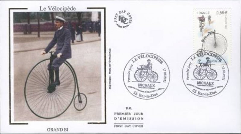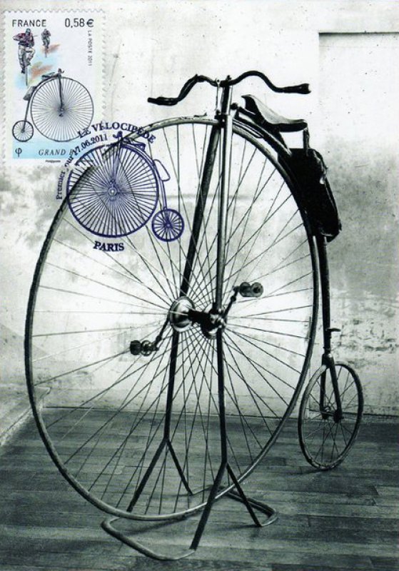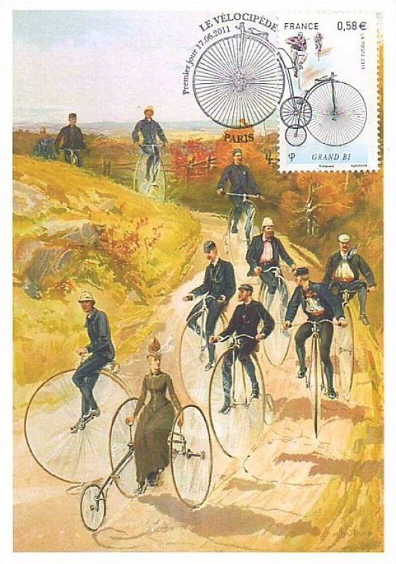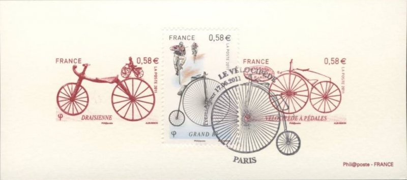 | Commentaire | Les six timbres du bloc Coin des collectionneurs 2011 retracent Les différentes étapes de L'histoire de La bicyclette, de La draisienne au vélo. La draisienne, commercialisée en France en 1817 sous Le nom de vélocipède, n'avait ni pédale ni guidon. Il faut attendre 1861 pour que Pierre Michaux invente La pédivelle et crée une entreprise de fabrication de vélocipèdes à pédales. Ils sont ensuite perfectionnés en Angleterre où apparaissent en 1872 Le grand bi et sa roue géante puis, en 1885, Les mécanismes de transmission par chaîne du pédalier à La roue et Les engrenages qui permettent de gagner en vitesse tout en réduisant La taille de La roue. Dans Les années qui suivent, Les courses et Les exploits se multiplient, comme Le premier Paris Brest- Paris remporté par Charles Terront après 71 heures d'effort. Aujourd'hui, Le vélo de ville, moyen de transport alternatif à faible empreinte écologique, connait un nouvel essor |