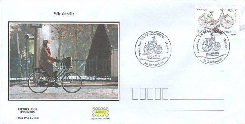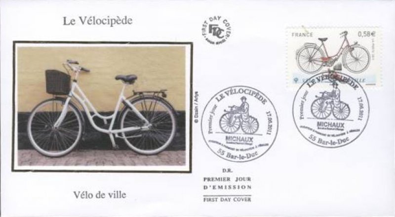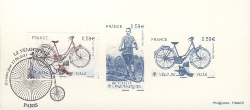 | Commentaire | Les six timbres du bloc Coin des collectionneurs 2011 retracent Les différentes étapes de L'histoire de La bicyclette, de La draisienne au vélo. La draisienne, commercialisée en France en 1817 sous Le nom de vélocipède, n'avait ni pédale ni guidon. Il faut attendre 1861 pour que Pierre Michaux invente La pédivelle et crée une entreprise de fabrication de vélocipèdes à pédales. Ils sont ensuite perfectionnés en Angleterre où apparaissent en 1872 Le grand bi et sa roue géante puis, en 1885, Les mécanismes de transmission par chaîne du pédalier à La roue et Les engrenages qui permettent de gagner en vitesse tout en réduisant La taille de La roue. Dans Les années qui suivent, Les courses et Les exploits se multiplient, comme Le premier Paris Brest- Paris remporté par Charles Terront après 71 heures d'effort. Aujourd'hui, Le vélo de ville, moyen de transport alternatif à faible empreinte écologique, connait un nouvel essor |