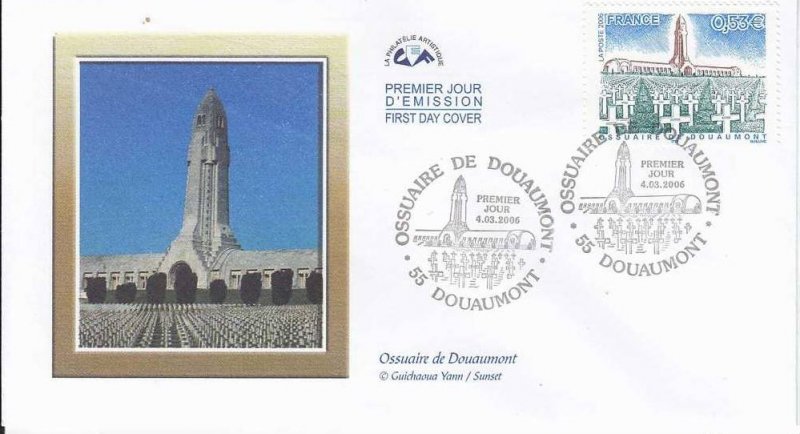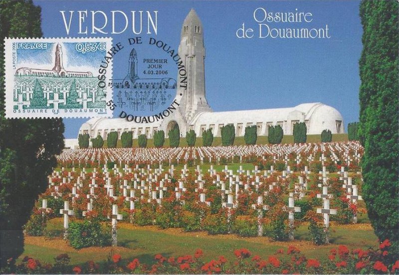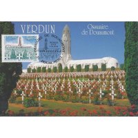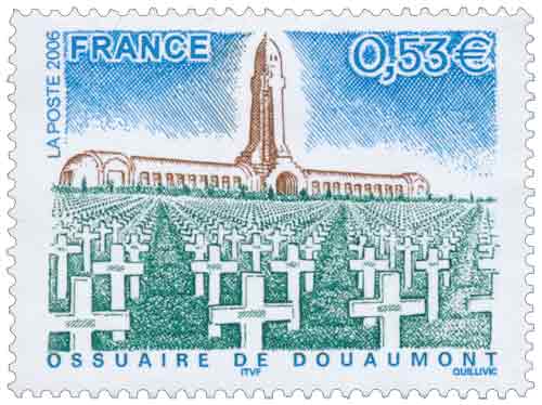 | Description | Ossuaire de Douaumont (Meuse). Représentation de la chapelle accueillant les restes de 130 000 soldats inconnus, et d'une partie du cimetière où reposent les soldats français et allemands morts pendant la bataille de Verdun |
