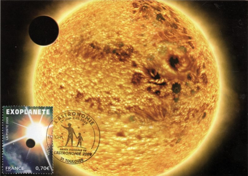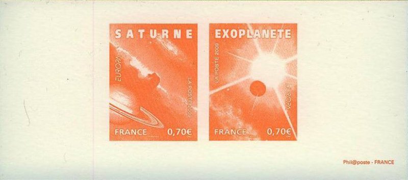 | Commentaire | La mise en vente anticipée a lieu le 3 mai au Parlement européen à Strasbourg et à la Cité de l'espace à Toulouse. Aurélie Baras dessine le timbre à date premier jour : un adulte et un enfant stylisés observent les étoiles dans le ciel. L’Unesco a déclaré 2009 année mondiale de l’astronomie. A cette occasion 104 pays organisent des actions pour mieux faire connaître l’astronomie et PostEurop a retenu l’Astronomie pour thème des timbres Europa 2009. Saturne et une exoplanète illustrent les 2 timbres, sur un fond stellaire, et pour évoquer toute l’histoire de l’astronomie, la lunette de Galilée, qui a marqué l’astronomie instrumentale, fait écho au télescope spatial COROT mis sur orbite en décembre 2006. Cette mission est la première expérience spatiale capable de découvrir des planètes extrasolaires telluriques et d'étudier des phénomènes et des objets jamais observés jusqu'à ce jour.. Certains détails du bloc seront recouverts d’une encre pailletée. |