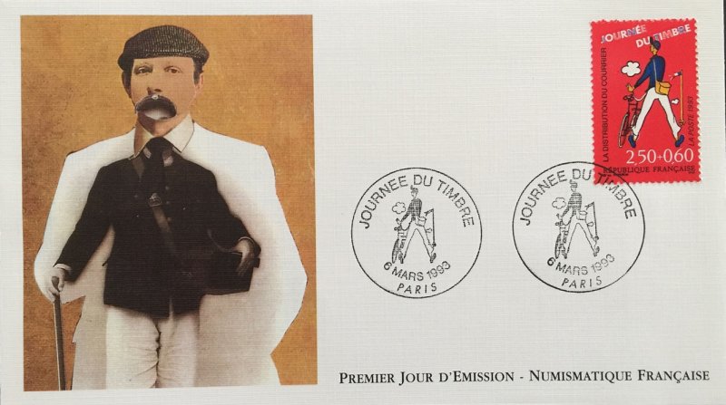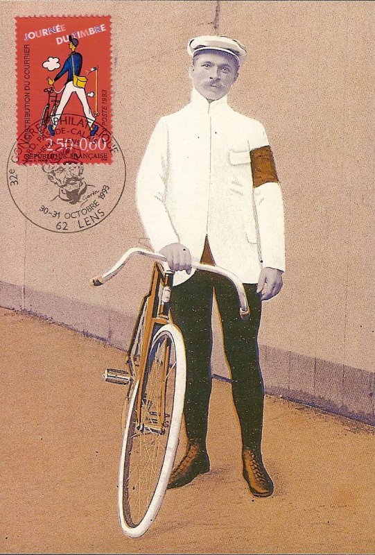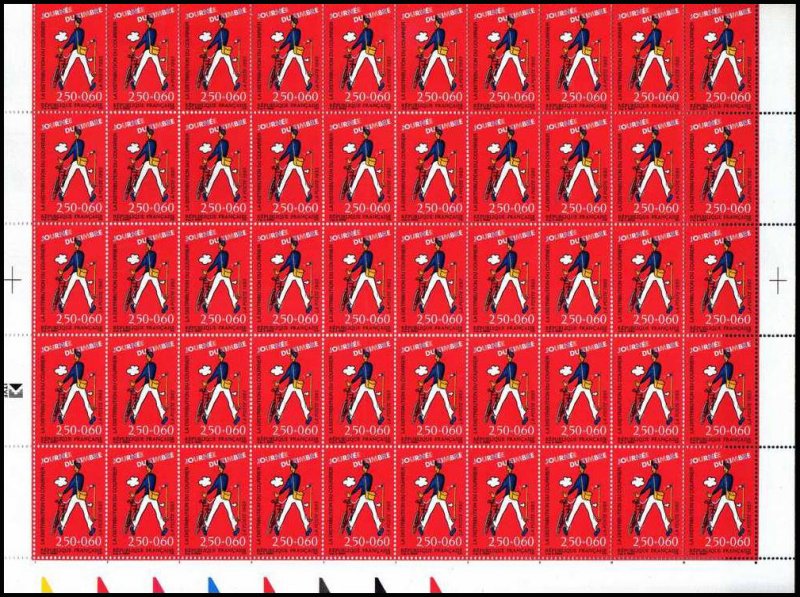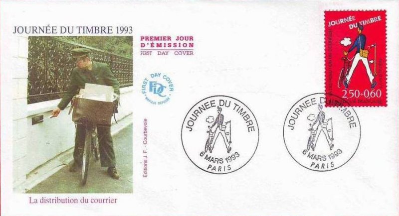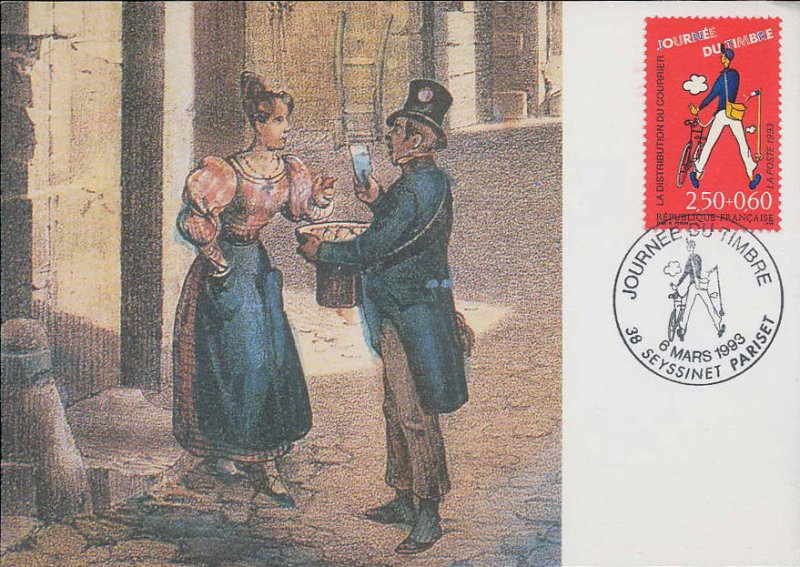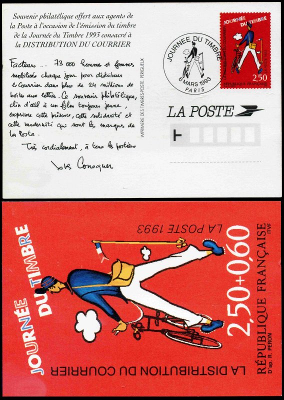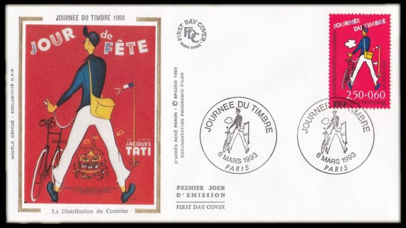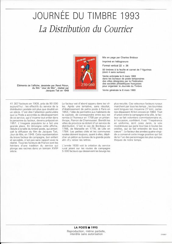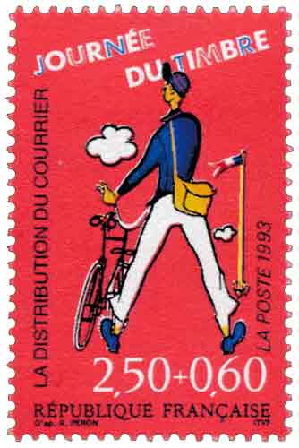 | Description | Journée du Timbre. Les métiers de la Poste. La distribution du courrier, d'après une affiche dessinée pour le film Jour de Fête de Jacques Tati |