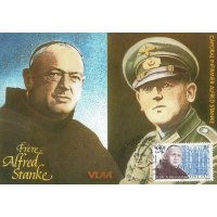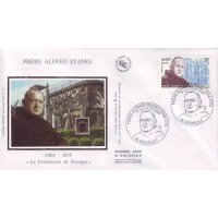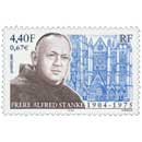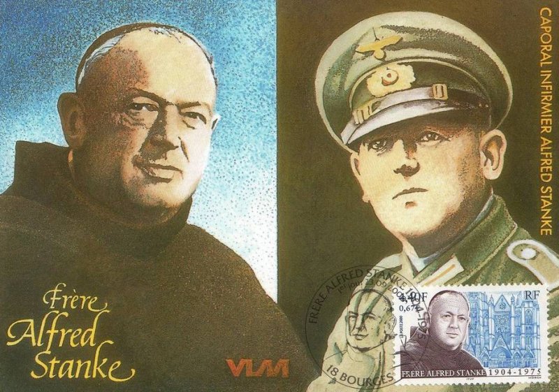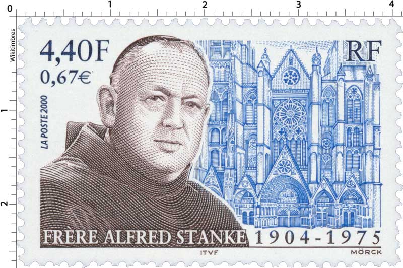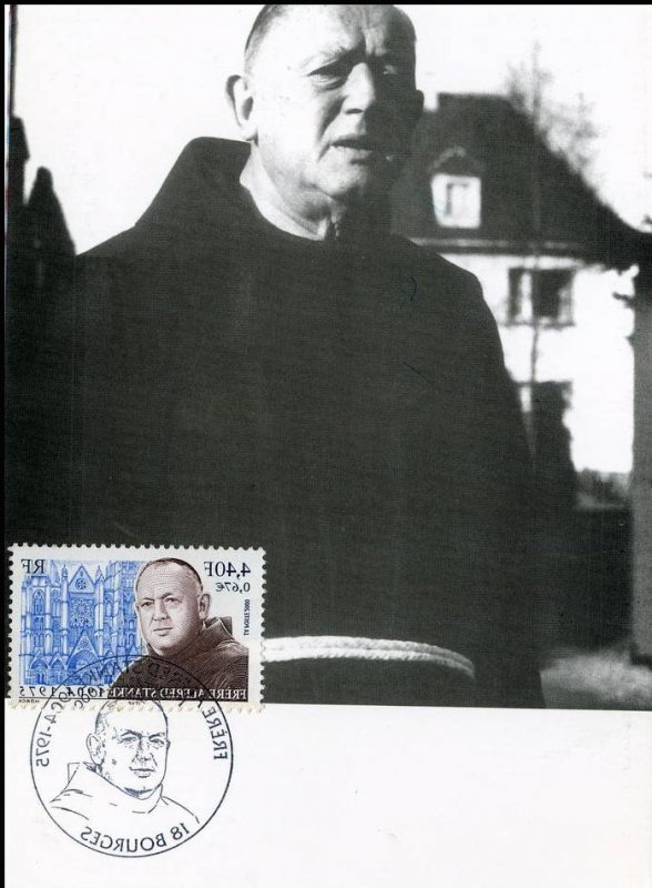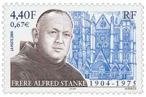 | Commentaire | Description synthétique du visuel du timbre : Frère Alfred Stanke, souvent nommé Le Franciscain de Bourges, soldat allemand durant la seconde guerre mondiale, sut conserver son idéal religieux sous l’uniforme vert-de-gris. Gardien à la prison du Bordiot à Bourges, il vint au secours des détenus à l’insu de la Gestapo. Un hommage est rendu, sur le timbre, à son dévouement, par le biais d’un portrait en habit de Franciscain sur un fond illustré par la Cathédrale de Bourges. |