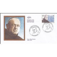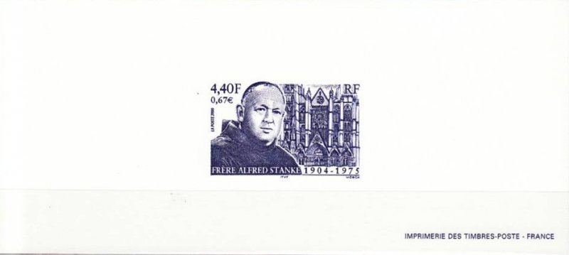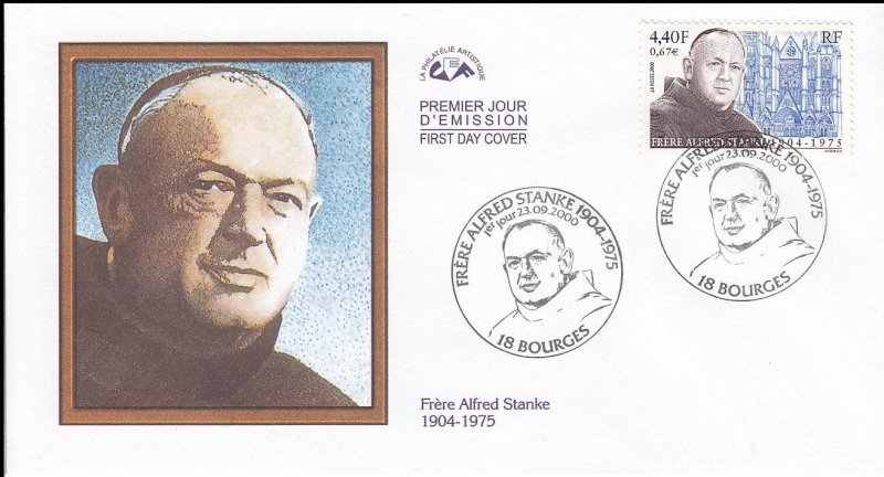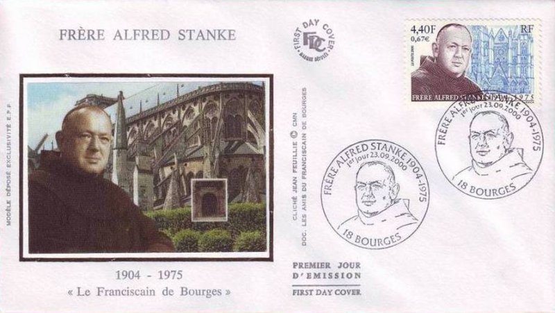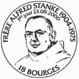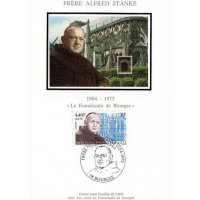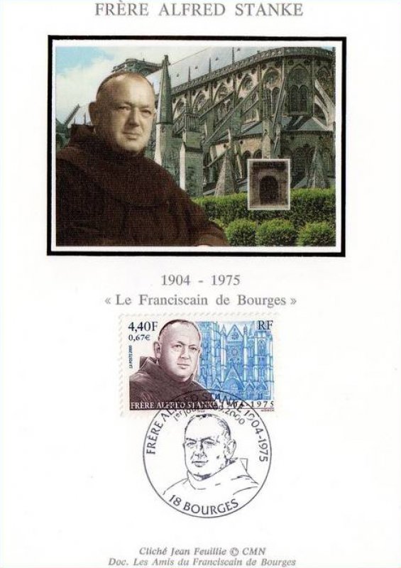| Description | 25e anniversaire de la mort du frère Alfred Stanke (1904-1975), infirmier militaire allemand et franciscain, qui aida les prisonniers résistants de la prison de Bourges, et représentation de la cathédrale de Bourges |