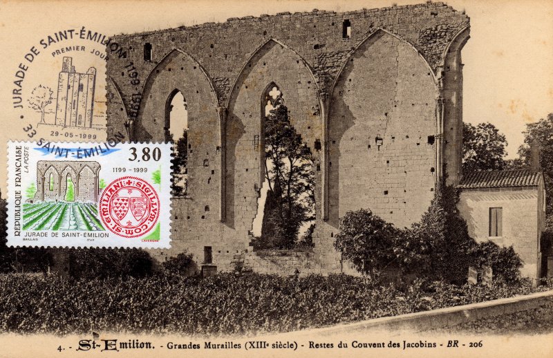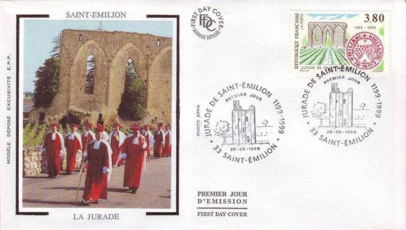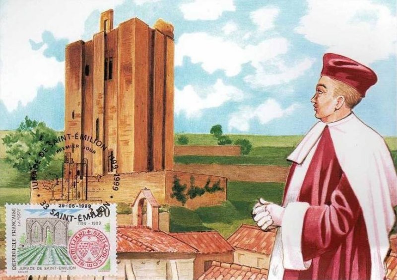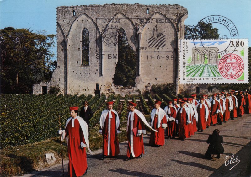 | Description | 800e anniversaire de la Jurade de Saint-Emilion (1199-1999), corporation professionnelle médiévale recréée en association folklorique pour promouvoir la viticulture de Saint-Émilion et représentation des ruines de l'église |