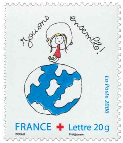 | Commentaire | « Dessine ton vœux pour les enfants du monde… » est la thématique du concours Croix-Rouge 2006, Yacine Lorafy et Margot Deram remportent le 1er Prix tous deux ex-æquo leurs illustrations sont reproduites dans ce carnet en 5 exemplaires. « Les racines du cœur » par Monsieur Christian Broutin illustre la couverture du carnet. Ce timbre est grevé d'une surtaxe au profit de la Croix Rouge française Émis uniquement en carnet |