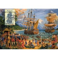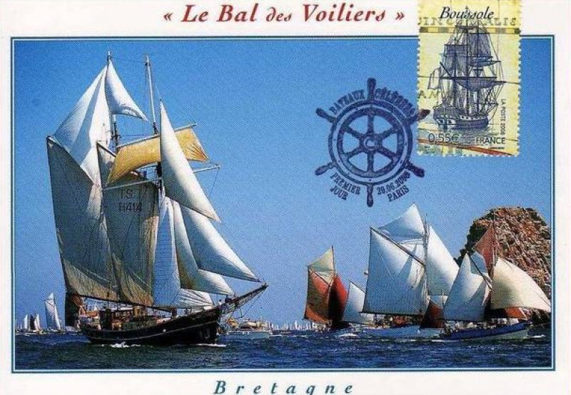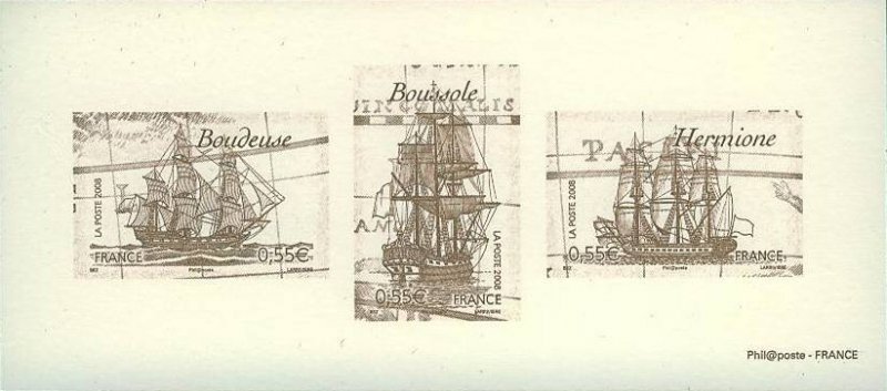 | Commentaire | premier jour en forme de hublot, la mise en vente anticipée a lieu du 20 au 22 juin au Salon du timbre, à Paris. Le week-end du 20 au 22 juin, des manifestations ont également lieu avec un cachet portant la mention « premier jour » à bord du chasseur de mines Cassiopée à Brest, au chantier de l'Hermione à Rochefort et à Rouen. Avec un cachet sans mention « premier jour », une mise en vente anticipée du bloc a lieu le 20 juin au musée La Pérouse d'Albi. En 2009, le bloc est élu « plus beau timbre de l'année » dans la catégorie « bloc de timbres thématiques » suite à un vote des internautes, organisé par Phil@poste. |