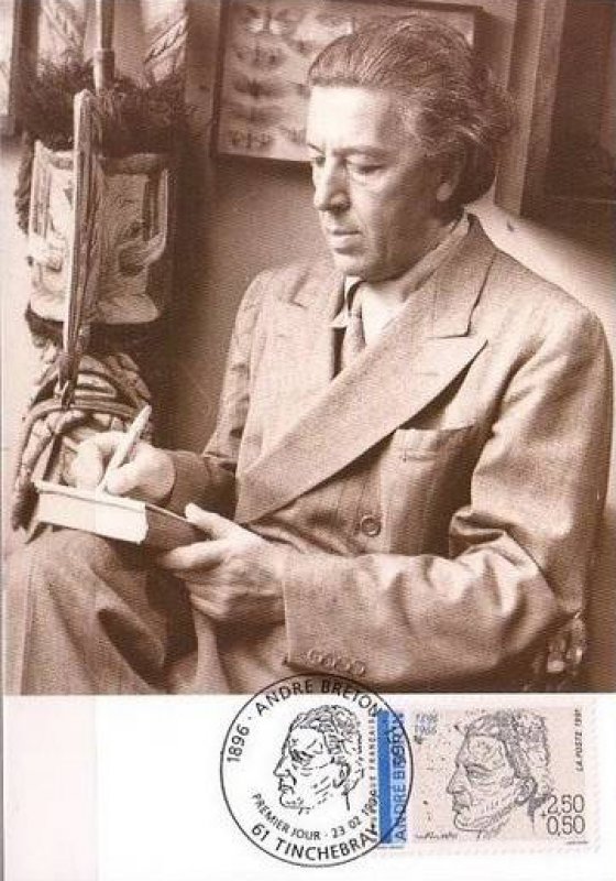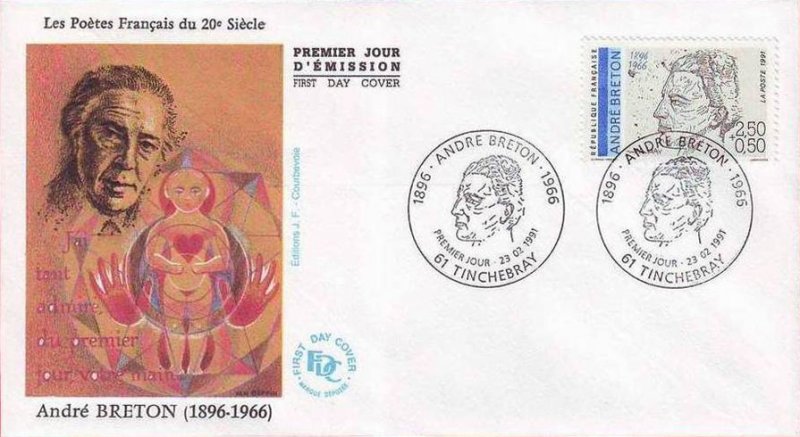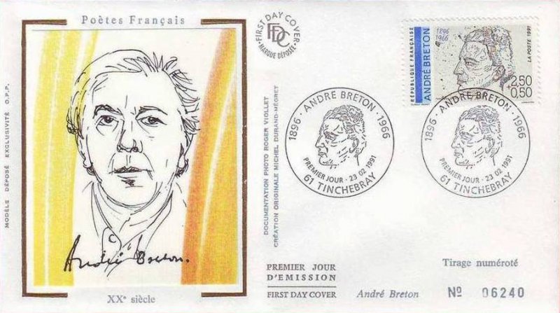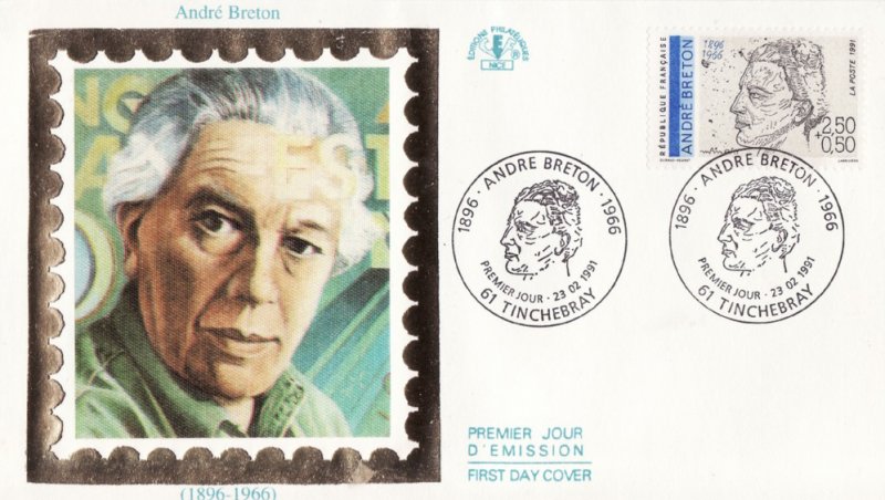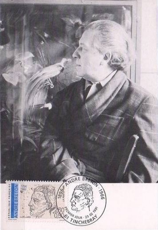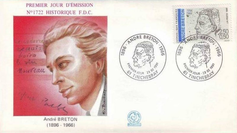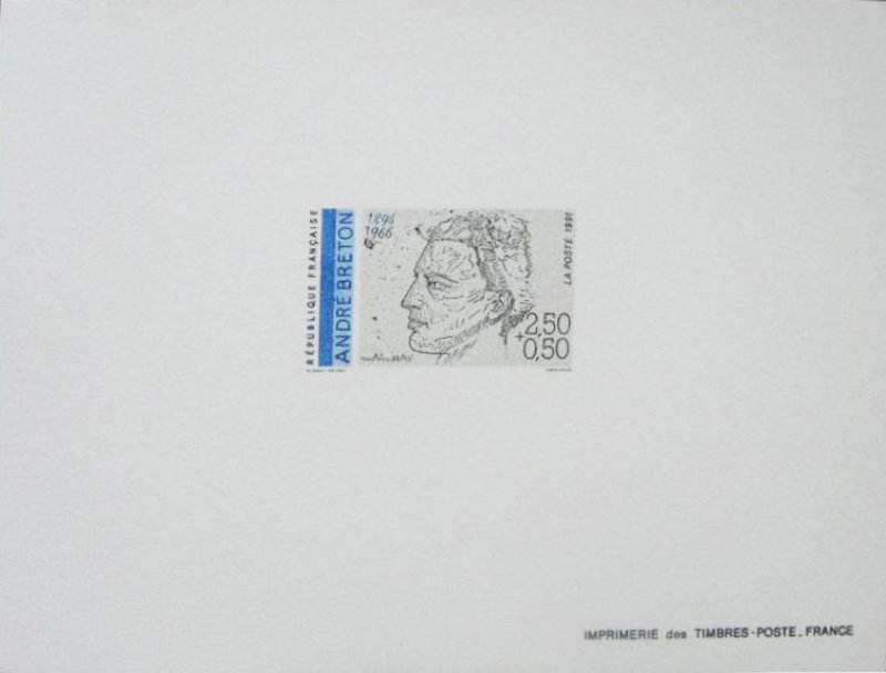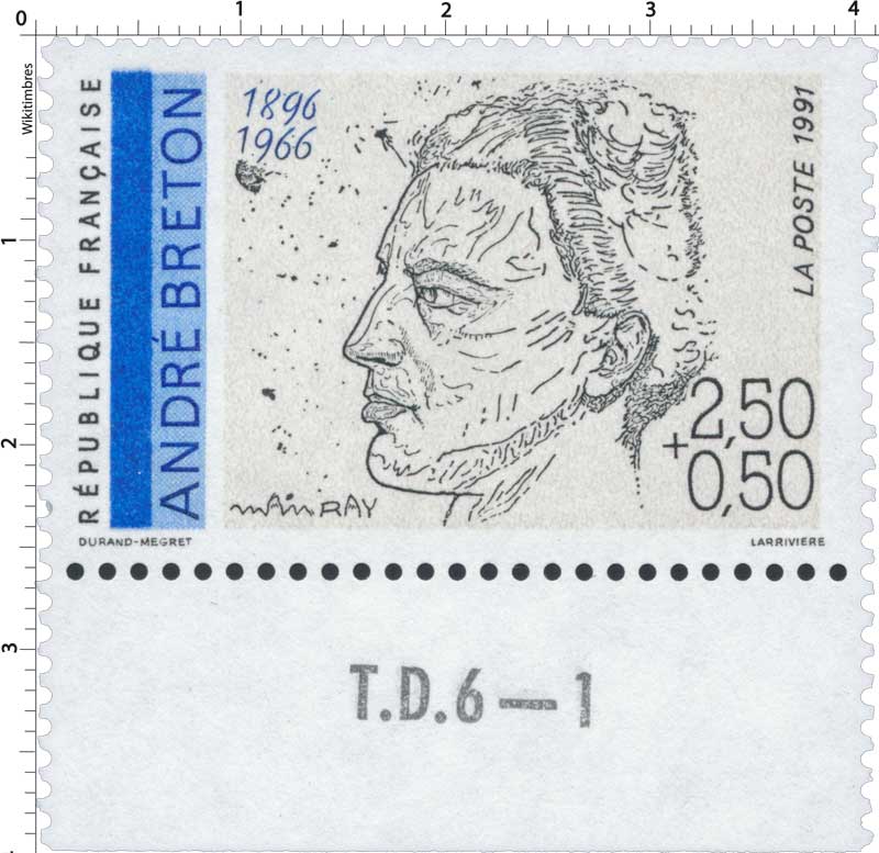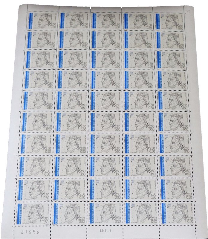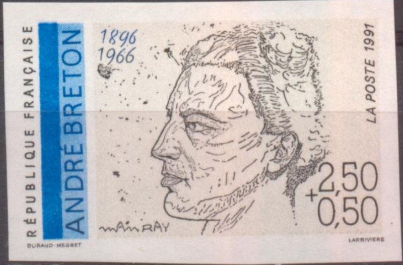 | Description | André Breton (1896-1966), écrivain, poète et théoricien du surréalisme, né à Tinchebray (Orne), portrait de Man Ray, issu d'une feuille de 50 TP |