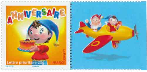 | Description | Timbre pour anniversaires. Depuis 2002, est utilisé un personnage de la fiction jeunesse : Oui-Oui tient un gâteau orné d'une bougie |