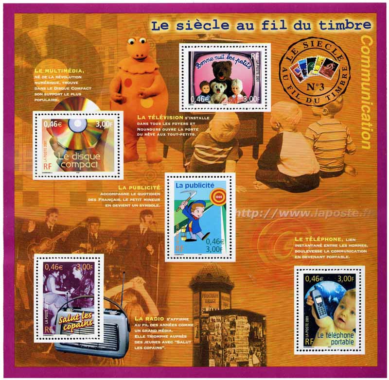 | Commentaire | Description synthétique du visuel du produit : Ce produit est le troisième bloc de la collection Le siècle au fil du timbre. Comme pour les blocs précédents, les thèmes des timbres ont été choisis à la suite d’une consultation auprès des Français. Les cinq sujets plébiscités par le public pour ce troisième bloc commémorant les évènements ayant marqué le siècle en matière de communication sont : Bonne nuit les petits (les incontournables de la télévision), Le disque compact (les supports de diffusion), le petit mineur (les publicités qui ont fait date), Salut les copains (les grandes heures de la radio), Le téléphone portable (les outils personnels de communication). Sont mis en scène sur le fond : un disque vinyle, Casimir, des enfants regardant la télévision, un groupe musical, l’arobase et une adresse internet pour illustrer le web, un kiosque à journaux en hommage à la presse écrite. Pour conserver la logique de collection, le format, le cachet d’oblitération et la typographie du titre ont été conservés. Afin de renouveler l’intérêt des amateurs de timbres, l’esprit en est plus contemporain, les couleurs plus modernes et chaudes. |