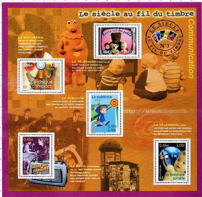 | Commentaire | Description synthétique du visuel du produit : Ce produit est le troisième bloc de la collection Le siècle au fil du timbre. Comme pour les blocs précédents, les thèmes des timbres ont été choisis à la suite d’une consultation auprès des Français. Les cinq sujets plébiscités par le public pour ce troisième bloc commémorant les évènements ayant marqué le siècle en matière de communication sont : Bonne nuit les petits (les incontournables de la télévision), Le disque compact (les supports de diffusion), le petit mineur (les publicités qui ont fait date), Salut les copains (les grandes heures de la radio), Le téléphone portable (les outils personnels de communication). Sont mis en scène sur le fond : un disque vinyle, Casimir, des enfants regardant la télévision, un groupe musical, l’arobase et une adresse internet pour illustrer le web, un kiosque à journaux en hommage à la presse écrite. Pour conserver la logique de collection, le format, le cachet d’oblitération et la typographie du titre ont été conservés. Afin de renouveler l’intérêt des amateurs de timbres, l’esprit en est plus contemporain, les couleurs plus modernes et chaudes. |