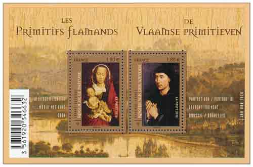 | Commentaire | PREMIER JOUR : 6 novembre 2010 Vente Anticipée : au Salon d’Automne - Paris (Porte de Champerret) et le Carré d’Encre -Paris. VENTE NATIONALE à partir du 8 novembre 2010 À l’occasion de l’émission commune France- Belgique, le timbre réunit ce que l’Histoire a séparé : deux volets d’un diptyque dû à Rogier van der Weyden (connu en France sous le nom de Roger de Le Pasture). La vierge à l’enfant, œuvre localisée au Musée des Beaux-arts de Caen, faisait partie d’un diptyque dont le volet droit, Le portrait de Laurent Froimont, se trouve au Musée Royal des Beaux-arts de Bruxelles. Rogier van der Weyden a été fortement influencé par son aîné Jan van Eyck. Le fond du bloc reprend un détail d’une œuvre de ce dernier : La Vierge du Chancelier Rolin, conservée au Musée du Louvre . Timbre à date conçu par Patte & Besset