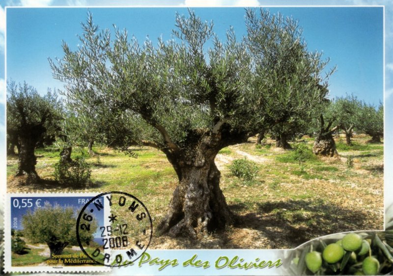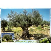 | Commentaire | La mise en vente anticipée a lieu le 13 juillet, à Paris, avec la reprise de l'olivier photographié sur l'oblitération premier jour de Claude Perchat Visuel : l'olivier millénaire transplanté le 23 sept.1988, au pied du Pont du Gard, né en Espagne, en l'an 908 – 5 m de circonférence de tronc, et 15 m pour la souche (photo de Jenny Cundy) Avec son tronc sculpté par l'âge et sa toison de feuilles persistantes et argentées, la longévité de cet arbre légendaire peut dépasser celle du chêne. Chargé de légendes, l’olivier millénaire est un arbre symbole et les peuples du pourtour méditerranéen qui se nourrissent de ses fruits possèdent en commun les gestes ancestraux de sa culture. Aux dires des Grecs, l'olivier le plus vieux du monde, 3000 ans environ, se trouverait dans le village de Vouves, dans l'Ouest de la Crète. |