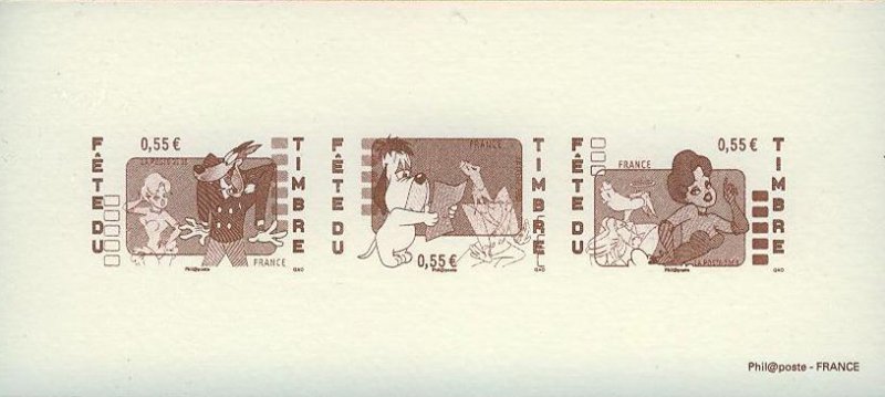 | Commentaire | Fête du timbre. Personnages des dessins animés de Tex Avery (1907-1980). La manifestation premier jour a lieu les 1er et 2 mars dans cent douze villes de France métropolitaine avec l'aide d'associations philatéliques locales. Le cachet premier jour, portant le nom d'une des villes, représente Droopy de face. |