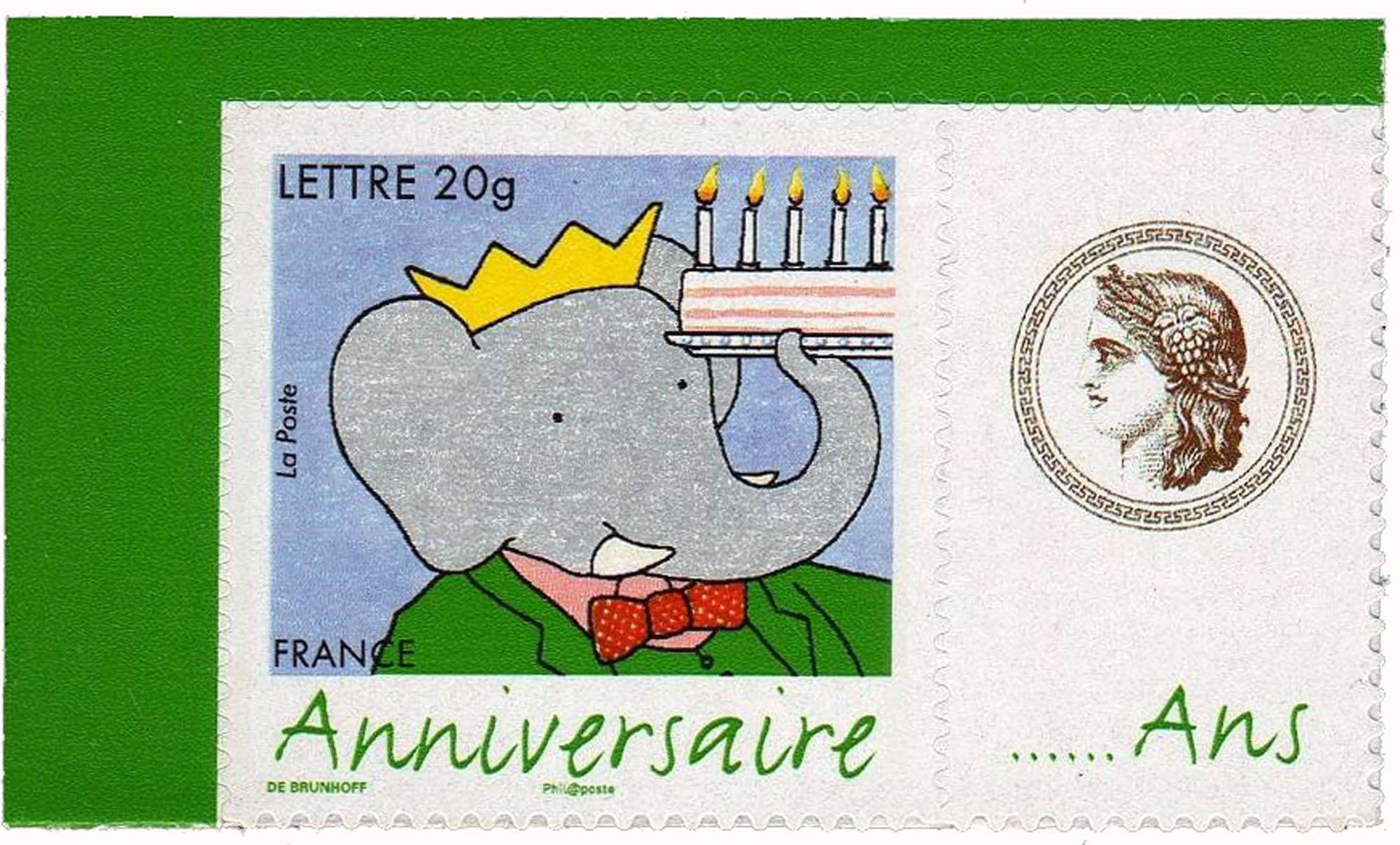 | Commentaire | En 2006, Babar fête ses 75 ans. Figure emblématique de la bande dessinée, créé par Jean de Brunhoff, puis repris par Laurent de Brunhoff, Babar incarne les valeurs fondamentales que sont la famille, la sagesse, le respect, l’écologie. Ce héros positif et aventureux est trans-générationnel et fait partie de la mémoire collective. Timbre sans millésime |