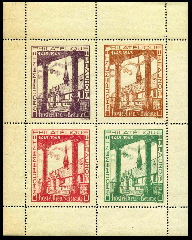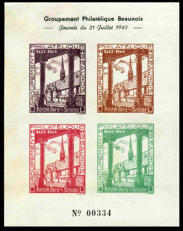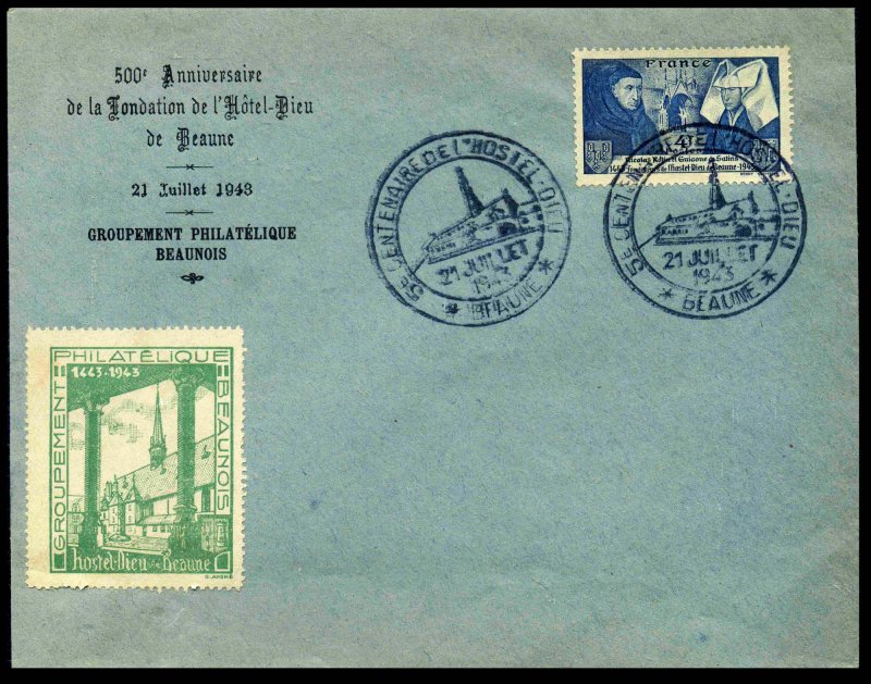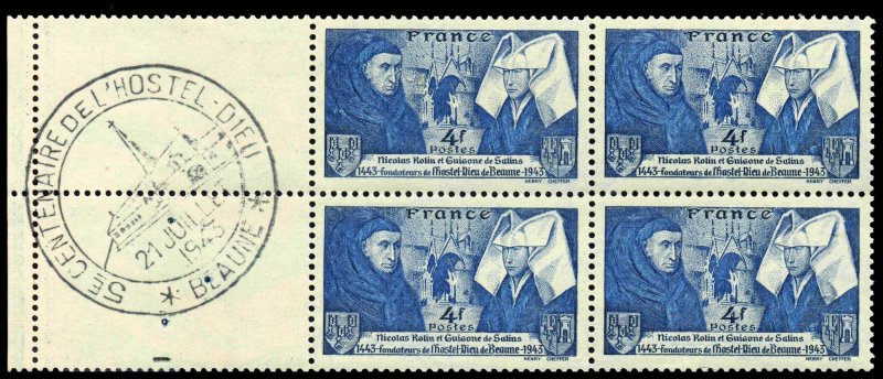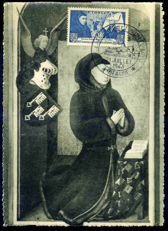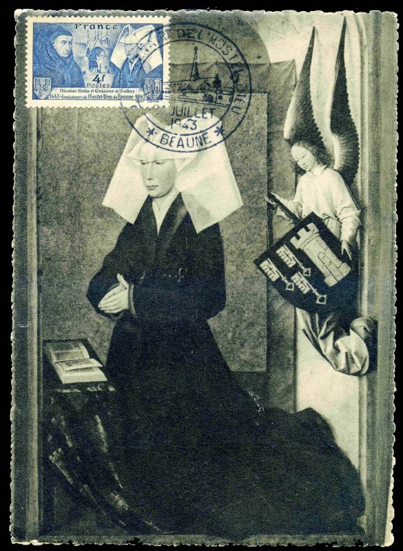 | Commentaire | Visuel : Nicolas Rolin et son épouse Guigone de Salins, fondateurs le 4 août 1443 de l'hostel-Dieu de Beaune, d'après le tableau de Rogier van der Weyden, dit Rogier de La Pasture (v.1400-1464, peintre du primitif flamand). Une reprise de la peinture des deux fondateurs, illustrant les panneaux extérieurs du Retable du "Jugement dernier". Les blasons de Nicolas Rolin ("Champ d'Azur à trois clefs d'Or, deux en chef une en pointe") et de Guigone de Salins ("Pour parti en I, d'azur à trois clefs d'or posées 2 et 1 (qui est de Rolin) et en II, d'azur à la tour d'or maçonnée de sable (qui est de Salins) et la porte d'entrée piétonne de l'Hôtel-Dieu, surmontée de son baldaquin de style gothique. En savoir plus sur Wikipédia : Nicolas Rolin En savoir plus sur Wikipédia : Guigone de Salins |