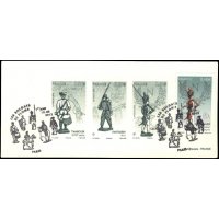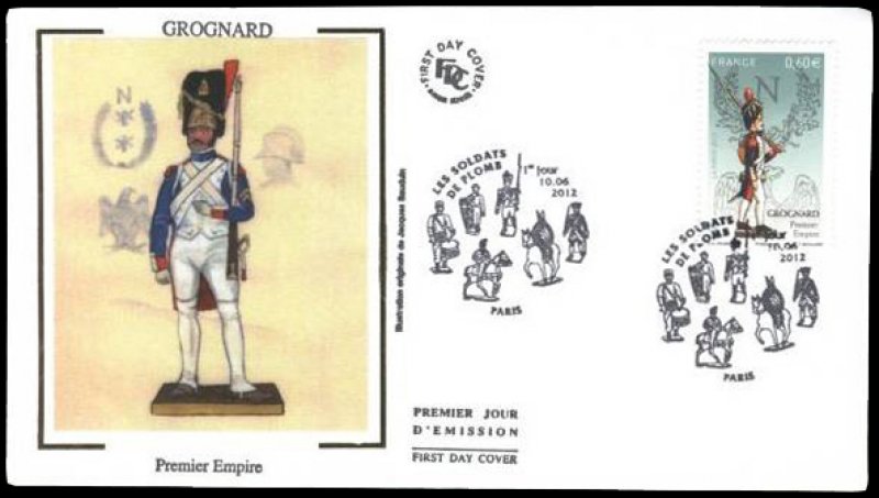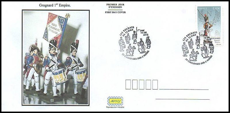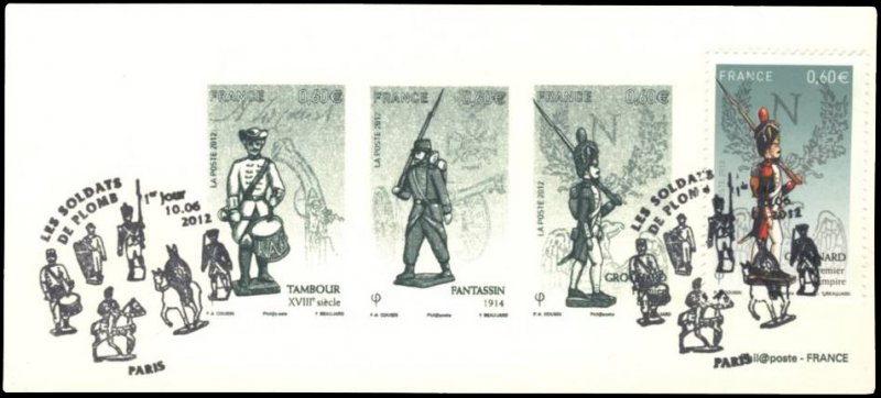 | Commentaire | Timbre à date “Premier Jour” conçu par Claude Perchat. Émis lors du salon du timbre 2012 Le soldat d'étain plat est né en Bavière au XVIIIe siècle. C'est à Nuremberg que les artisans créent de petites figurines d'étain à l'image des combattants de l'armée prussienne. L'intérêt de ces figurines réside dans le fait que les soldats sont représentés dans une grande diversité d'attitudes : à genoux, couchés ou debout. L'étain devenu trop onéreux, le plomb le remplace progressivement comme matière première. Les soldats de plomb représentent toutes les armées du monde, toutes époques confondues. Ils se développent en France surtout après la défaite de 1870, dans un esprit “revanchard” et militariste. Le désintérêt pour le soldat de plomb par la jeune clientèle sonne le glas de cette tradition. Le statut change et le soldat de plomb devient une figurine de collection pour les adultes. |