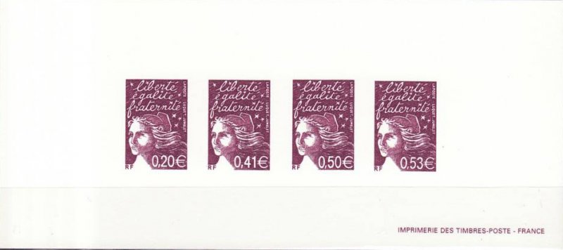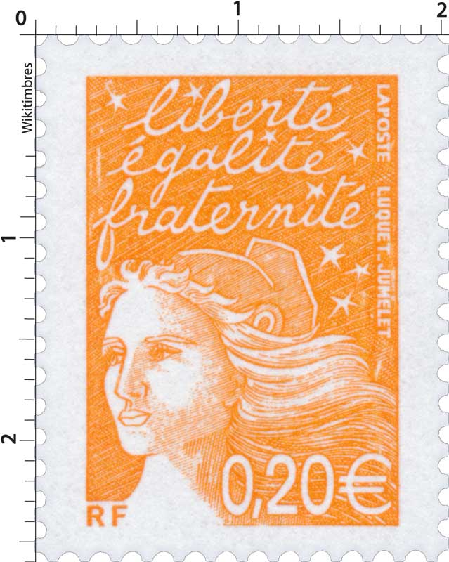 | Commentaire | Description synthétique du visuel du timbre : En janvier 2002, 15 nouvelles Marianne du 14 juillet seront émises en simple affichage euro. Le TVP, sans affichage de la valeur, est émis plus tôt (août 2001). La nouvelle série émise correspond aux : 8 pièces en euro : 0,01 € - 0,02 € - 0,05 € - 0,10 € - 0,20 € - 0,50 € - 1,00 € - 2,00 € 1er, 2e et 3e échelon de poids de la lettre zone 1, service prioritaire : TVP / 0,69 € (= 4,50 F) / 1,02 € (= 6,70 F) 1er, 2e et 3e échelon de poids de la lettre zone 1, service écopli : 0,41 € (= 2,70 F) / 0,53 € (= 3,50 F) / 0,64 € (= 4,20 F) 1er échelon de la zone 2 et 4, service prioritaire : 0,58 € (= 3,80 F) / 0,67 € (= 4,40 F). Les timbres imprimés en 2001 en feuilles monobloc portent dans la marge supérieure la mention : Timbres en euros mis en vente à partir du 1er janvier 2002 . |