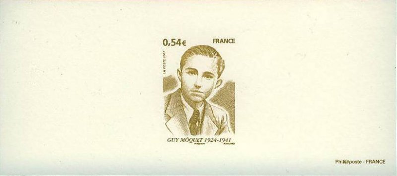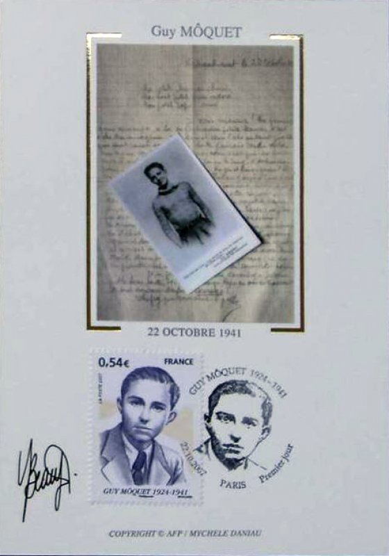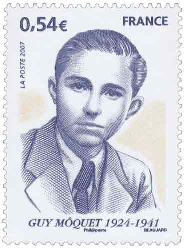| Commentaire | Guy Môquet (1924-1941), résistant. Guy Môquet est né le 26 avril 1924. Fils d’un député communiste, il milite lui-même aux jeunesse communistes. L’arrestation de son père en octobre 1939 renforce son ardeur et il ne cesse plus alors de coller et distribuer des tracts reflétant la ligne de son parti, épinglant la misère, dénonçant l’occupation étrangère et réclamant la libération des prisonniers communistes. Il est arrêté en octobre 1940, passé à tabac, emprisonné puis, bien qu’acquitté, transféré au camp de Chateaubriand. Le 20 octobre 1941, de jeunes communistes tue Karl Hotz, alors commandant des troupes d’occupations de la Loire inférieure. Le ministre de l’intérieur du gouvernement de collaboration de Pétain sélectionne alors 50 prisonniers communistes « pour éviter que 50 bons Français » soient fusillés en représailles. Parmi eux, 27 otages du camp de Châteaubriant, dont le plus jeune est Guy Môquet. Il sera fusillé le 22 octobre 1941. Depuis, Guy Môquet a été cité à l’ordre de la Nation en 1944, une rue et une station de métro porte son nom depuis 1946 et de nombreuses commémorations rendent toujours hommage aux fusillés de Chateaubriand. En 2007, le Président de la République, Nicolas Sarkozy évoque lui aussi Guy Môquet, instaurant notamment la lecture de sa dernière lettre dans les lycées et inscrivant un timbre à son effigie au programme 2007 |