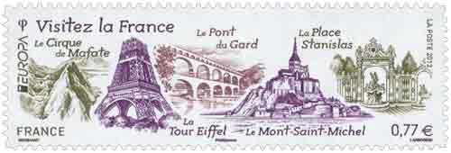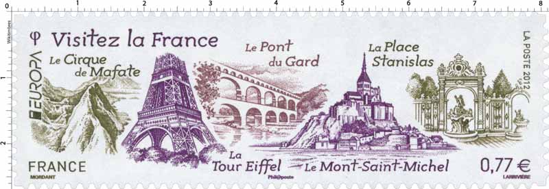 | Commentaire | la place Stanislas à Nancy, le Mont Saint-Michel, la Tour Eiffel, le Pont du Gard et le Cirque de Mafate, à la Réunion (La mise en vente réelle de ce timbre se situe vers le 18 juin 2012) |
