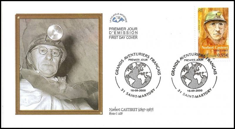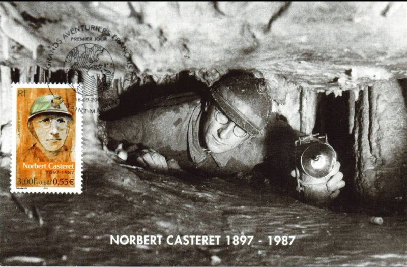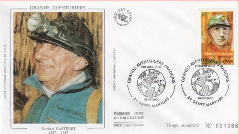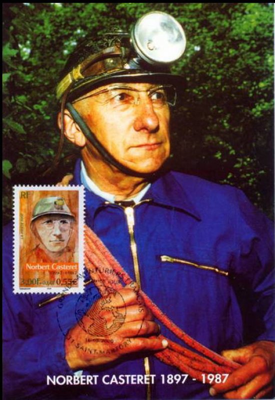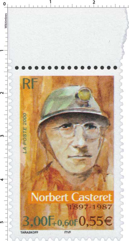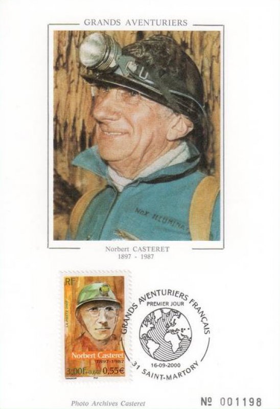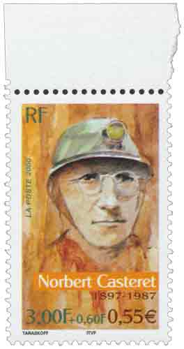 | Commentaire | Description synthétique du visuel du timbre : Né en Haute-Garonne en 1897, Norbert Casteret fut de l’âge de 12 ans jusqu’à 28 ans, un explorateur solitaire. Puis il entraîna dans ses séances et découvertes souterraines sa femme et ses cinq enfants. Enfin, il participa en équipes à des expéditions de grande envergure jusqu’en 1970. Spéléologue, préhistorien, écrivain et conférencier, il explora 2000 cavernes, gouffres et rivières souterraines en Europe, Asie, Afrique et Asie. C’est mis en scène dans un paysage souterrain qu’il illustre le timbre. |